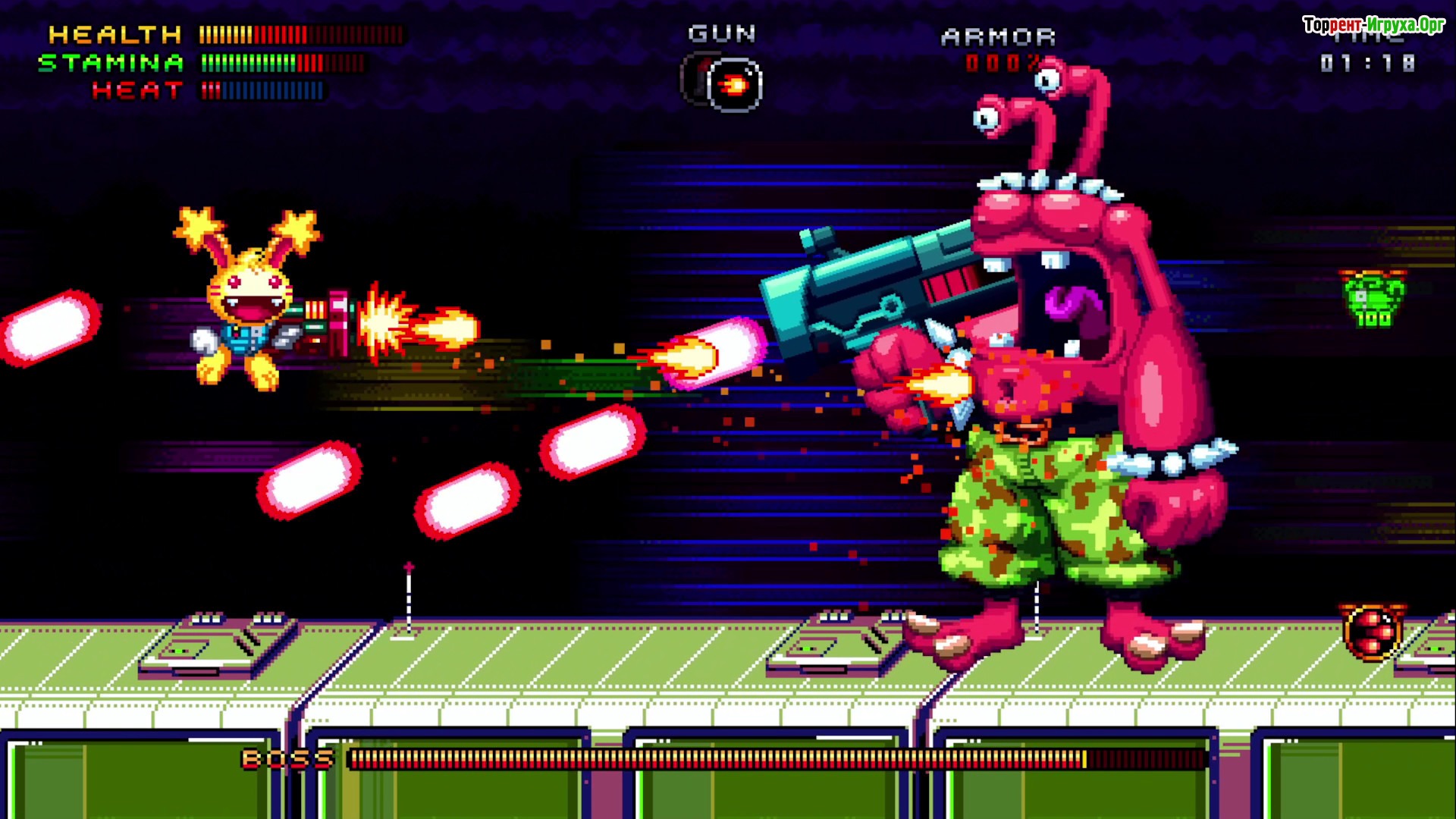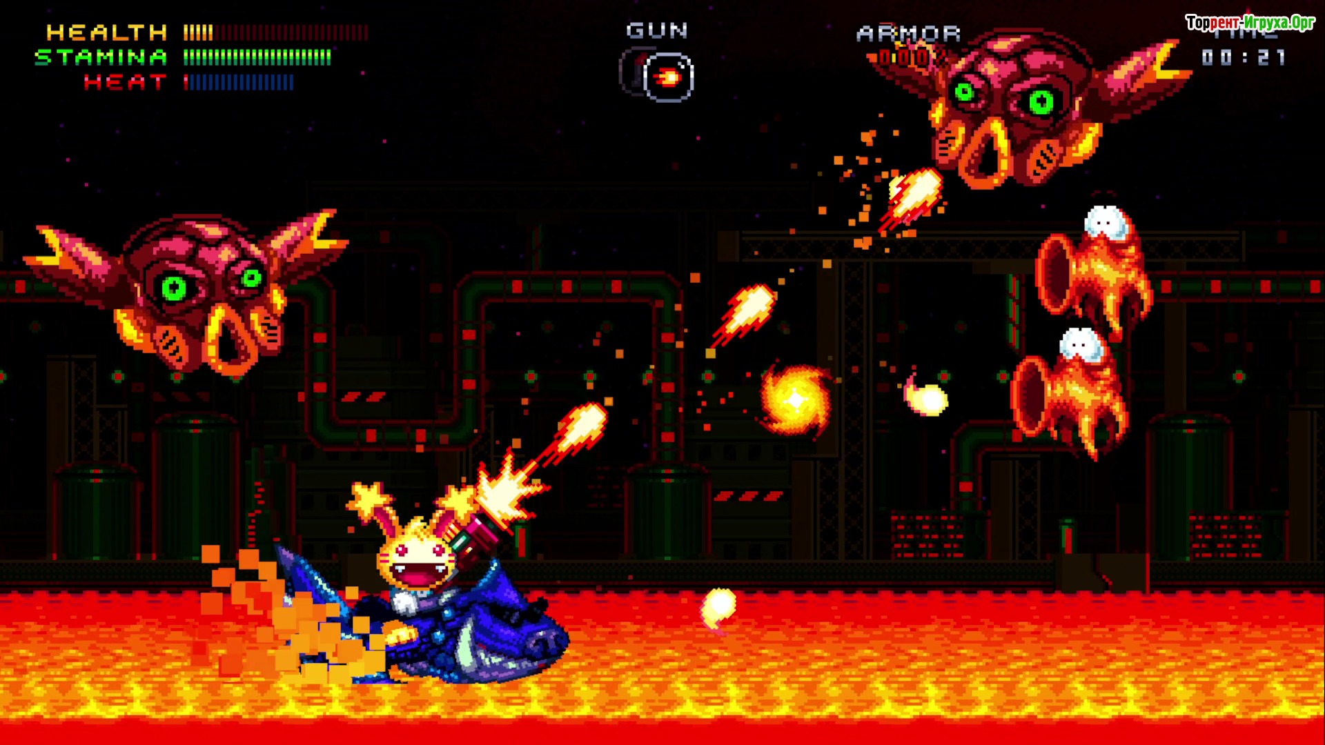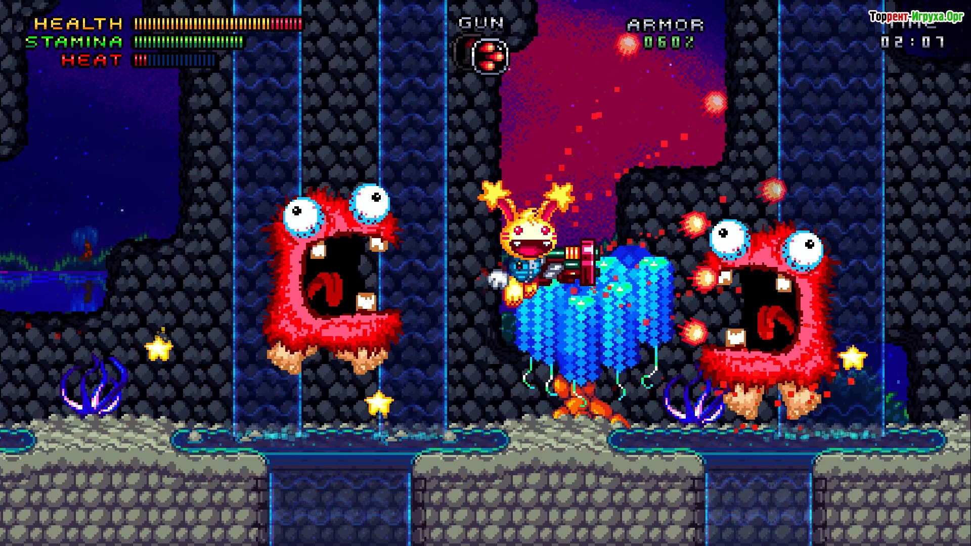 В Spectacular Sparky вас ждут захватывающие битвы с боссами, где главному герою помогает его верный спутник — необычный персонаж Свинул, наполовину свинья, наполовину акула. Вместе они путешествуют по красочным неоновым мирам, полным опасных ловушек, таких как лавовые реки, шипы и вращающиеся пилы. Атмосфера игры подчеркивается сочетанием юмора, сарказма Спарки и разнообразием космических врагов, что делает игровой процесс по-настоящему живым и интересным.