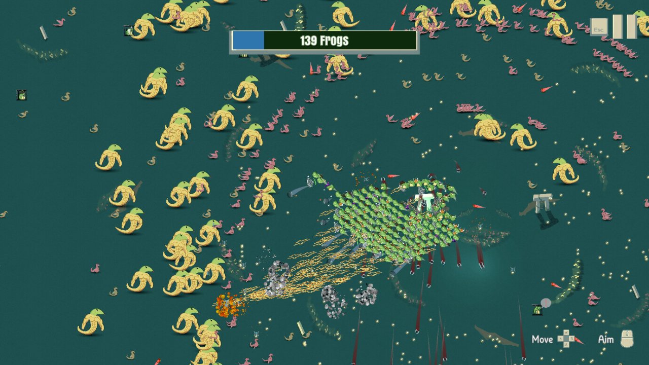 Frogmageddon представляет собой безумный экшен-рогалик в жанре Bullet Heaven, где геймер управляет последним героем Фроге, который стремится восстановить утраченную империю лягушек. Начав с единственного бойца, игрок развивает свою армию, которая с каждым побежденным врагом увеличивается до сотен уязвимых, но невероятно сплоченных амфибий. Игра объединяет динамичные битвы, элементы стратегии и юмористический абсурд, превращая каждое сражение в настоящий хаос.