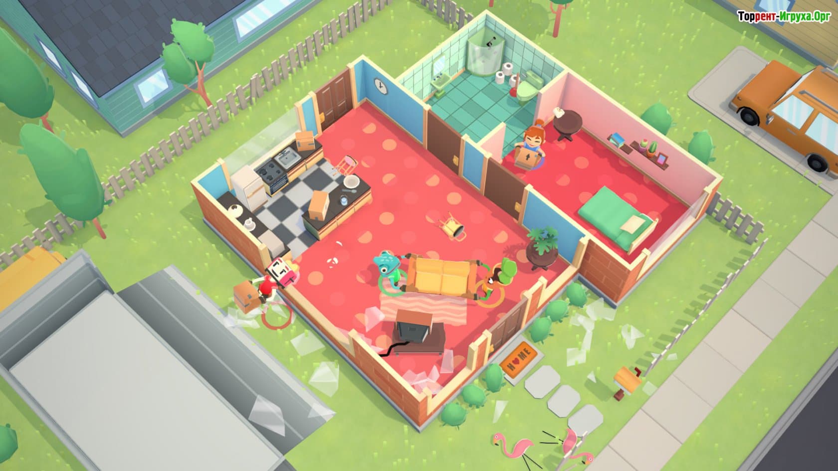 Возможность совместной игры делает процесс еще веселее: играть можно в одиночку или объединяться с друзьями в кооператив до 4 человек. Такая командная работа проверит на прочность ваши нервы и потребует слаженности. В Moving Out каждый переезд сопровождается реальной физикой — окна и двери станут не просто препятствиями, а поводом для хаоса, когда придется разбивать и ломать всё, чтобы выполнить задачи быстрее.