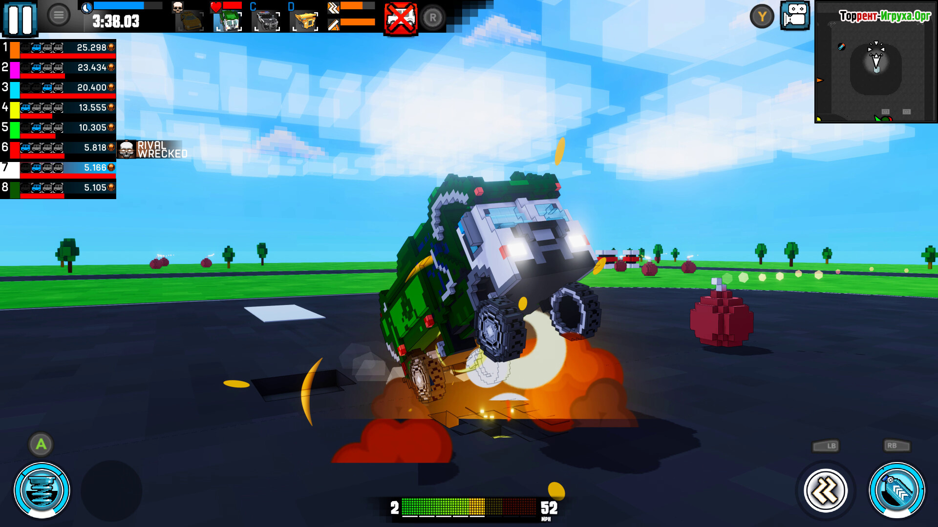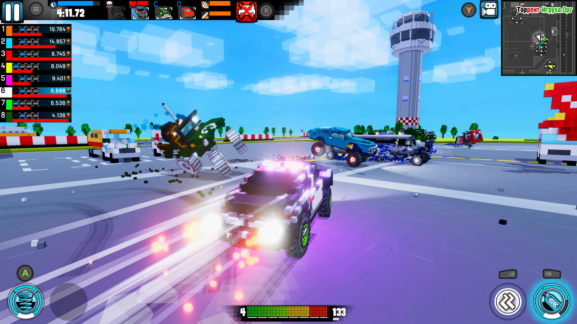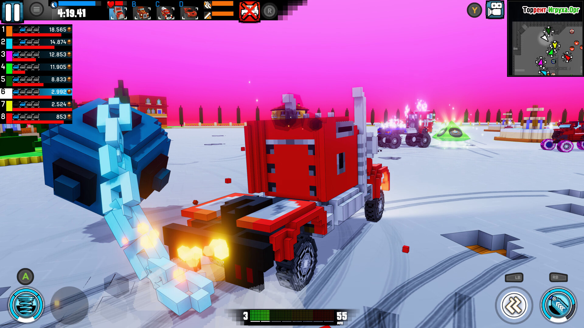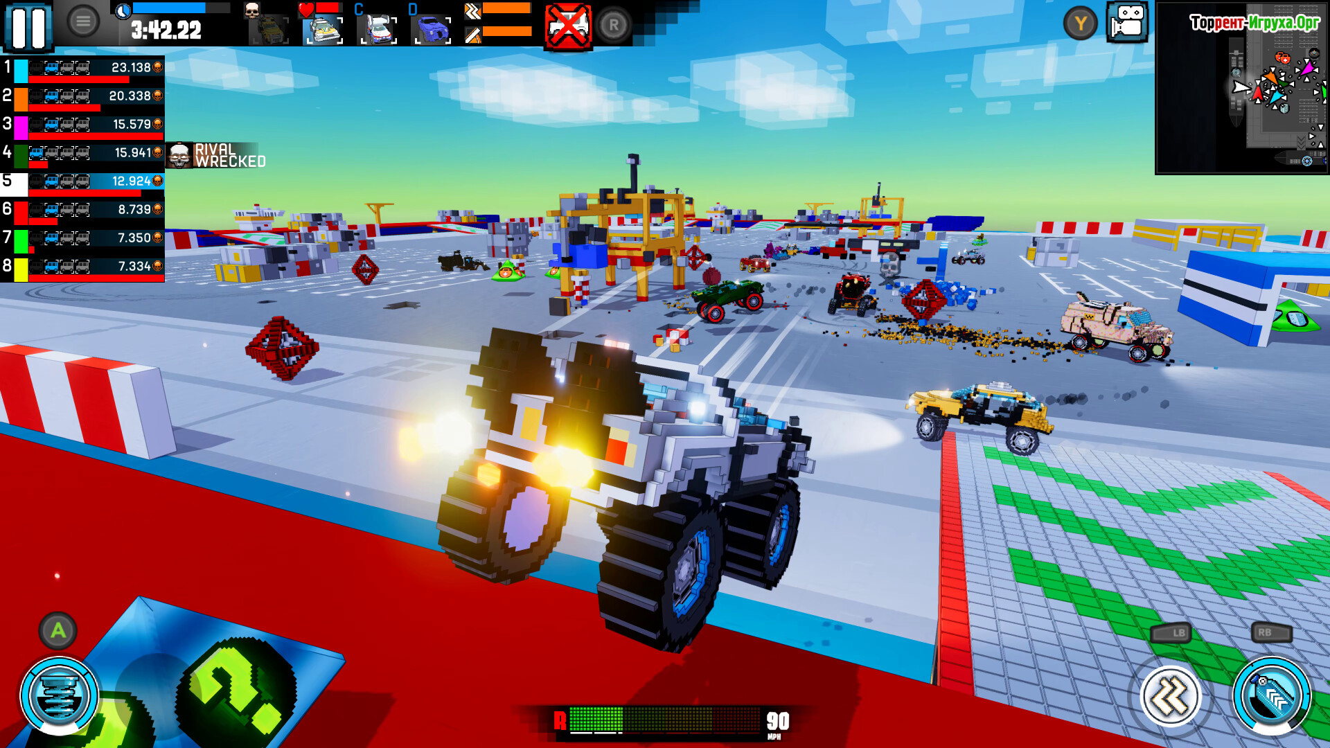 Выбирайте из широкого парка машин — от быстрых спортивных автомобилей до массивных внедорожников и грузовиков, каждая модель обладает своими характеристиками и стилем вождения. На аренах Carnage Battle Arena каждый удар и столкновение превращаются в настоящее зрелище, а визуальное оформление в духе 90-х придаёт атмосферу культовой ретро-гонки.