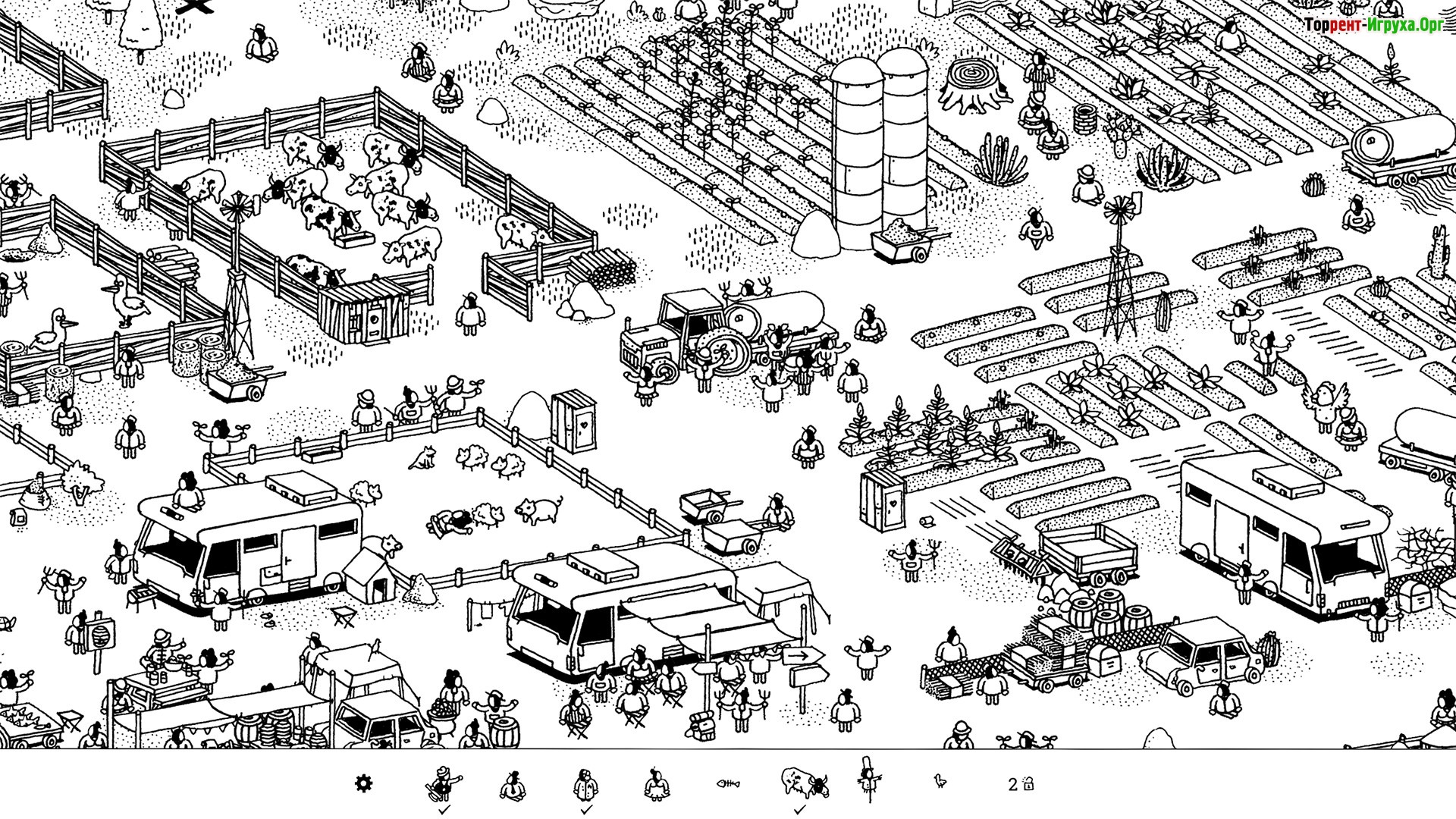 Визуально игра выполнена в стиле ручного рисунка, где объекты и персонажи словно сливаются в одно целое, создавая сложную и захватывающую головоломку. Это заставляет игроков проявлять смекалку и сосредоточенность, чтобы успешно решить поставленные задачи и найти все нужные элементы. Hidden Folks действительно увлекает и требует терпения, позволяя провести много времени в поисках на каждом уровне.