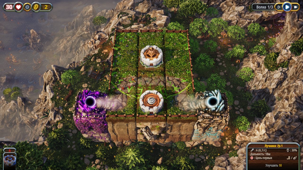 В игре надо будет думать. Башни открываются по мере прохождений уровней (башни не сохраняются (то есть если на 1 уровне у нас только лучник, то когда дойдем до башни арбалета, она будет доступна на том уровне где она есть, но не будет доступна на преведущих уровнях (к примеру на первом уровне ее не будет, будет только лучник и все))). Так же нет режима песочницы (нет уровня бесконечными волнами) зато есть 5 дополнительных уровней.