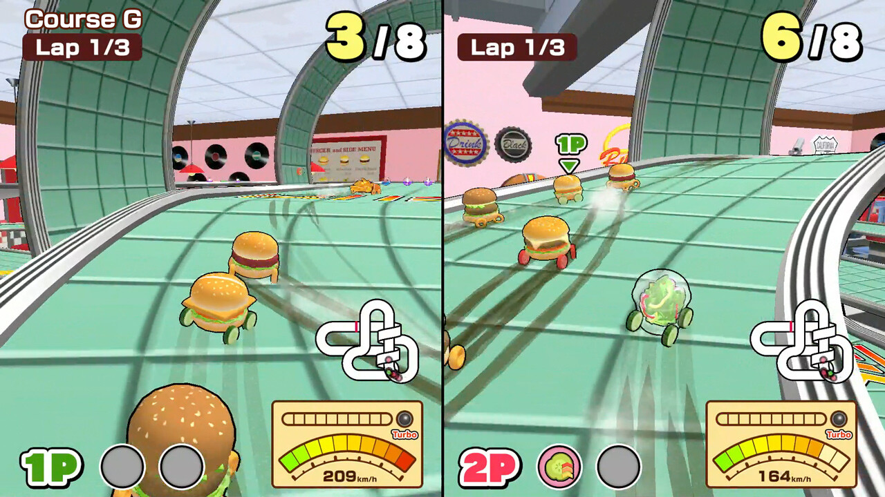 Используйте разнообразные хитрые приспособления, чтобы сбить с толку соперников и заставить их столкнуться. Однако будьте внимательны: в любой момент вас может настигнуть неожиданность, и свет может внезапно погаснуть, или же драгоценный камень свалится на голову. В "BURGER RACE" традиционные гоночные правила не действуют. Если хотите максимальной скорости — вперед! Но учитывайте, что повсюду могут встретиться ловушки, такие как потоки кетчупа, которые затопят дорогу.