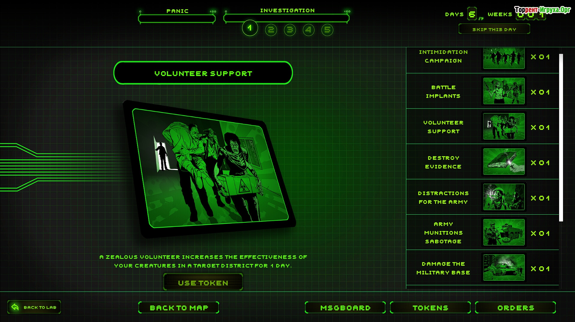 Когда ресурсы заканчиваются, ваши мутанты могут отправиться в город за необходимыми материалами. Для защиты своего убежища от посторонних придется устраивать панические набеги и отпугивать врагов. Военные силы начнут охоту за вами, а заражение граждан станет действенным способом замедлить преследование. Главная цель — не дать никому помешать вашим исследованиям и продолжить развитие мутагенов.