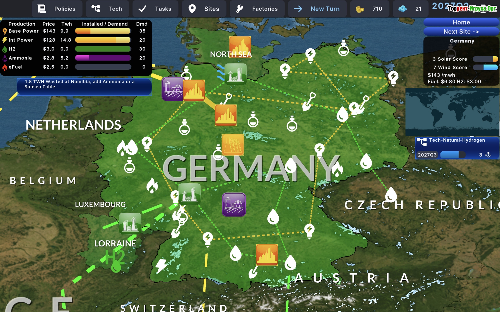 Power the Future от simnetzero-dev — политико-экономическая стратегия, в которой игрокам предстоит взять под контроль энергетические ресурсы с 2025 по 2038 год. В этой игре важно создать устойчивую сеть электроснабжения, сохранив стабильность экономики и избегая перегрузок. Правильное планирование использования солнечных панелей, водородных генераторов и морского ветра играет ключевую роль в развитии страны.