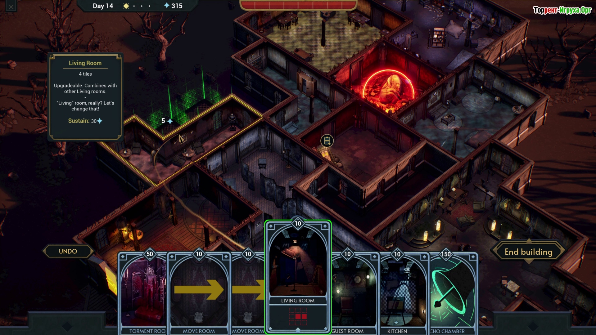 Что из себя представляет игра? Пошаговый тавер дефенс с колодой, на рандом. У тебя есть комнаты дома, которые надо строить (желательно в разнобой, в шахматном порядке), и люди, которые из хода в ход бегут в случайную следующую комнату, по направлению к сердцу дома. Ты составляешь колоду карт, чтобы убивать людей, либо сводить их с ума. За это ты получаешь поинты, на которые улучшаешь колоду в руке, или комнаты дома, добавляя им какие-то эффекты.