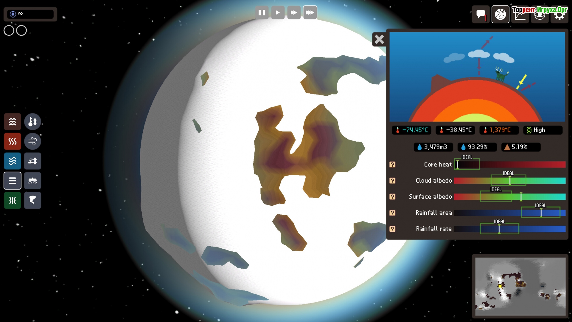 Planetary Life от Sotenbox — это уникальная творческая стратегия 2025 года, где игроку предстоит создать собственную планету с нуля. Управляйте тектоникой, климатом, осадками и температурой ядра, формируя неповторимый рельеф и задавая правила мира через настройку законов природы. Такой подход позволяет подготовить условия для зарождения жизни и дальнейшего её развития.