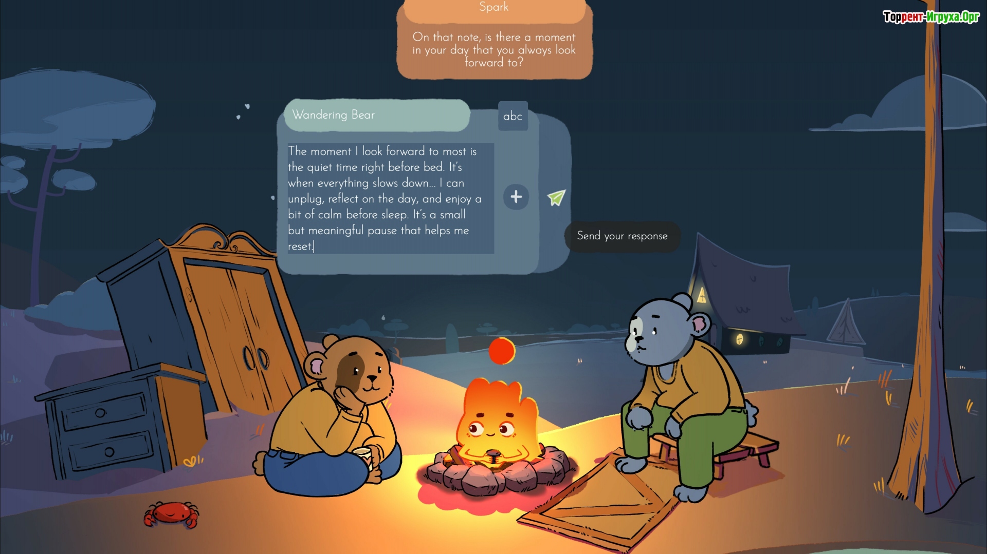 Игра предлагает возможность создать свой уютный уголок, подбирая предметы и размещая их вокруг костра, что помогает погрузиться в атмосферу спокойствия. В Fireside Feelings можно размышлять о простых и глубоких темах без спешки, наслаждаясь медитативным процессом и ощущая внутренний баланс.