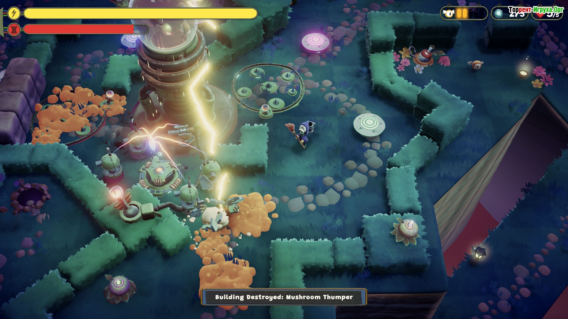 Природные элементы тоже становятся частью защиты: ягоды взрываются в руках противников, луковицы заманивают врагов в ловушки, а листья дают возможность скользить над пропастями. Эксперименты с предметами создают множество тактических вариантов, делая каждое прохождение по-настоящему непредсказуемым и интересным.