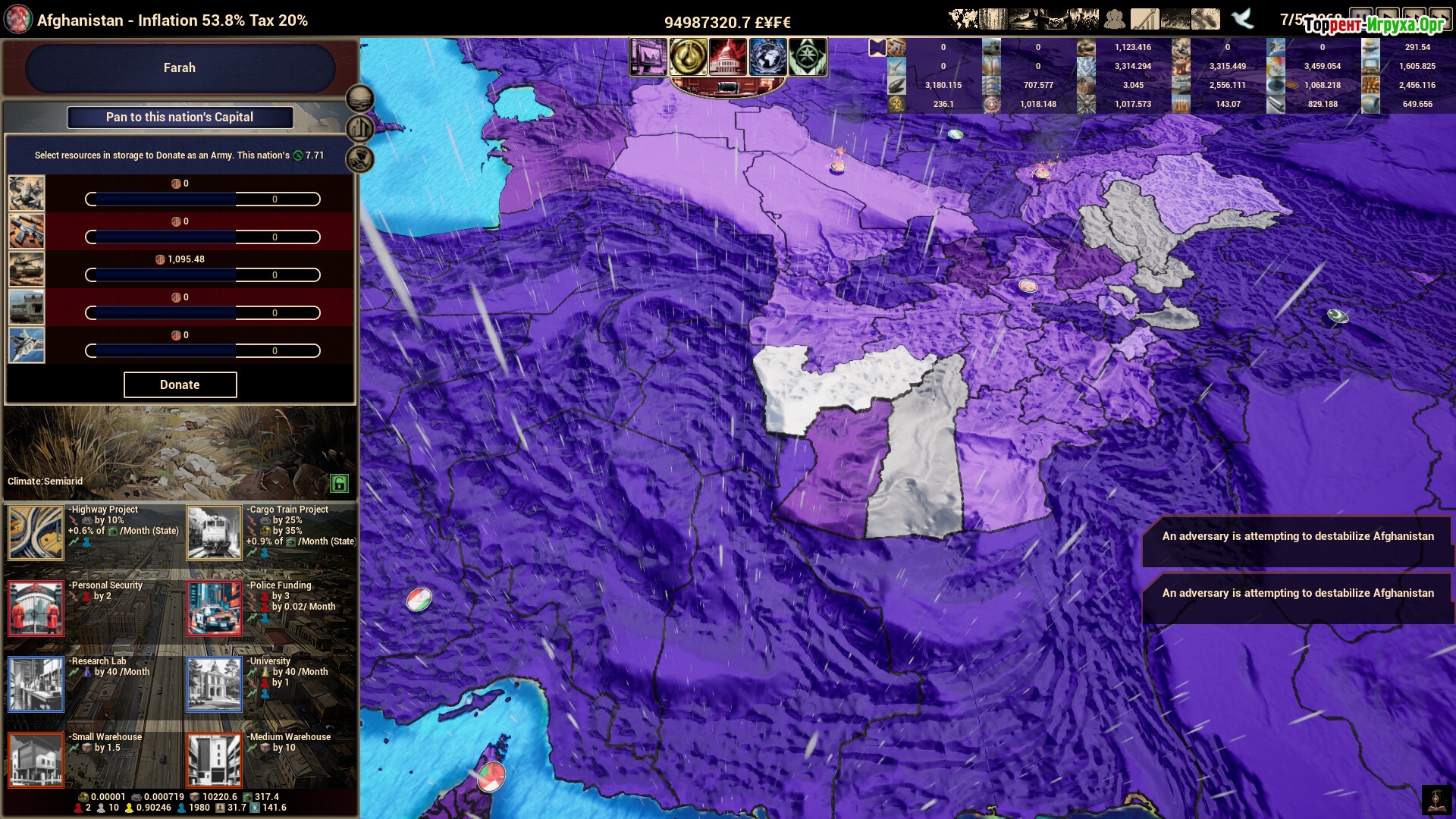 Начинайте как стратегический инвестор, постепенно расширяя территорию и укрепляя своё влияние. Заключайте выгодные сделки, приобретайте ключевые ресурсы и управляйте мировыми рынками, чтобы добиться своих целей. В распоряжении игрока окажутся ценные активы, такие как нефть, природный газ и современные технологии, которые помогут манипулировать политикой и направлять мировые события под свой контроль.