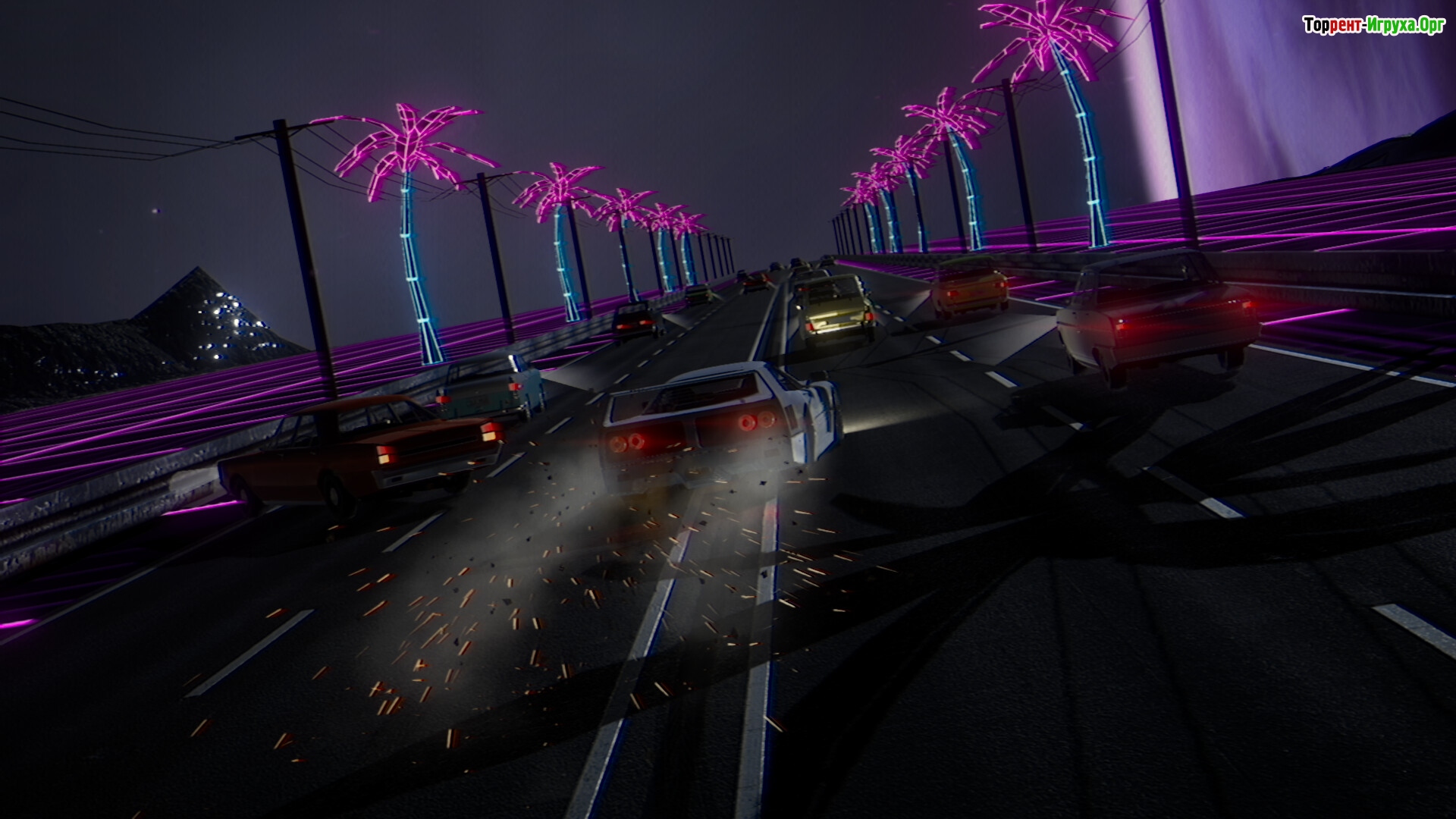 В игре представлено более 15 автомобилей с возможностью кастомизации и прокачки, более 20 уникальных миров, наполненных яркой ретроэстетикой, и 4 игровых режима для разного стиля прохождения. Саундтрек из 50 синтвейв-композиций создаёт атмосферу, придающую игре особую неповторимую атмосферу.