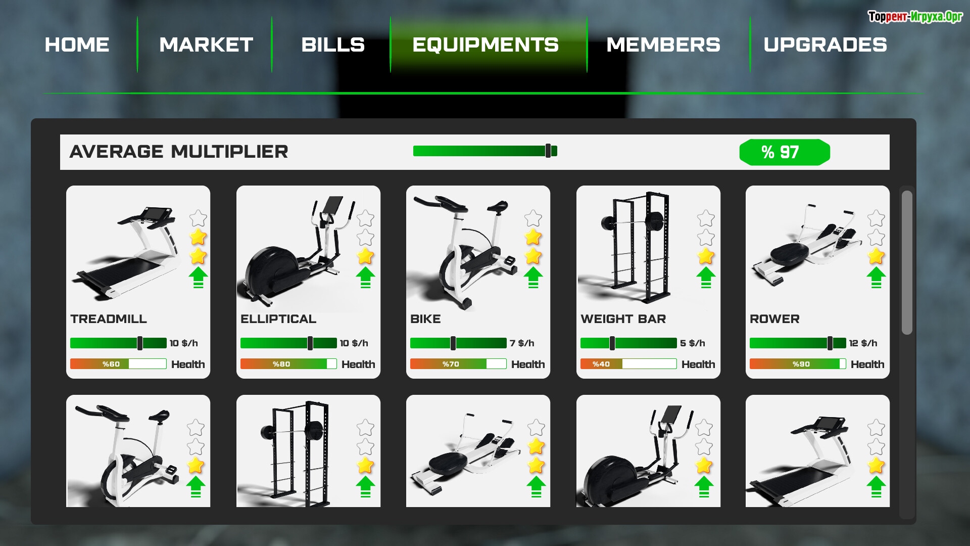 В процессе управления вы сможете не только приобретать современное оборудование, но и улучшать имеющиеся тренажеры для максимального комфорта клиентов. Важной частью игрового процесса становится ремонт помещений, замена декора и создание таких зон, как сауна, массажный салон, солярий и раздевалки – всё, что требует хороший спортивный клуб.
