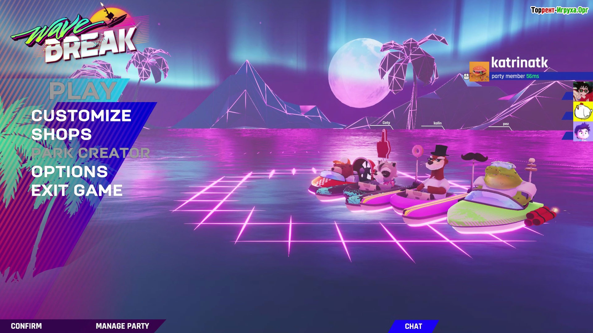 Звуковое оформление Wave Break заслуживает отдельного внимания — вам доступна легальная потоковая музыка с треками таких известных исполнителей, как Kalax и Timecop1983. Оригинальные композиции усиливают атмосферу и погружают в ритмичный мир водных гонок и трюков, делая игровой опыт еще более захватывающим.