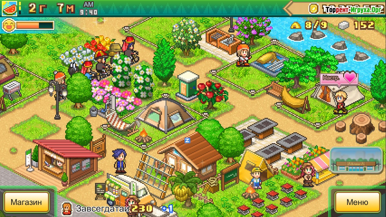 Игра привлекает своей атмосферой и разнообразием окружения, несмотря на пиксельный стиль графики. Лес, речка, животные и множество природных деталей создают живую и привлекательную территорию для вашего кемпинга. Туристы с удовольствием будут отдыхать здесь, приобретая еду и сувениры. Постоянное развитие и рост прибыли дадут возможность открыть собственный магазин и расширить ассортимент предлагаемых услуг.