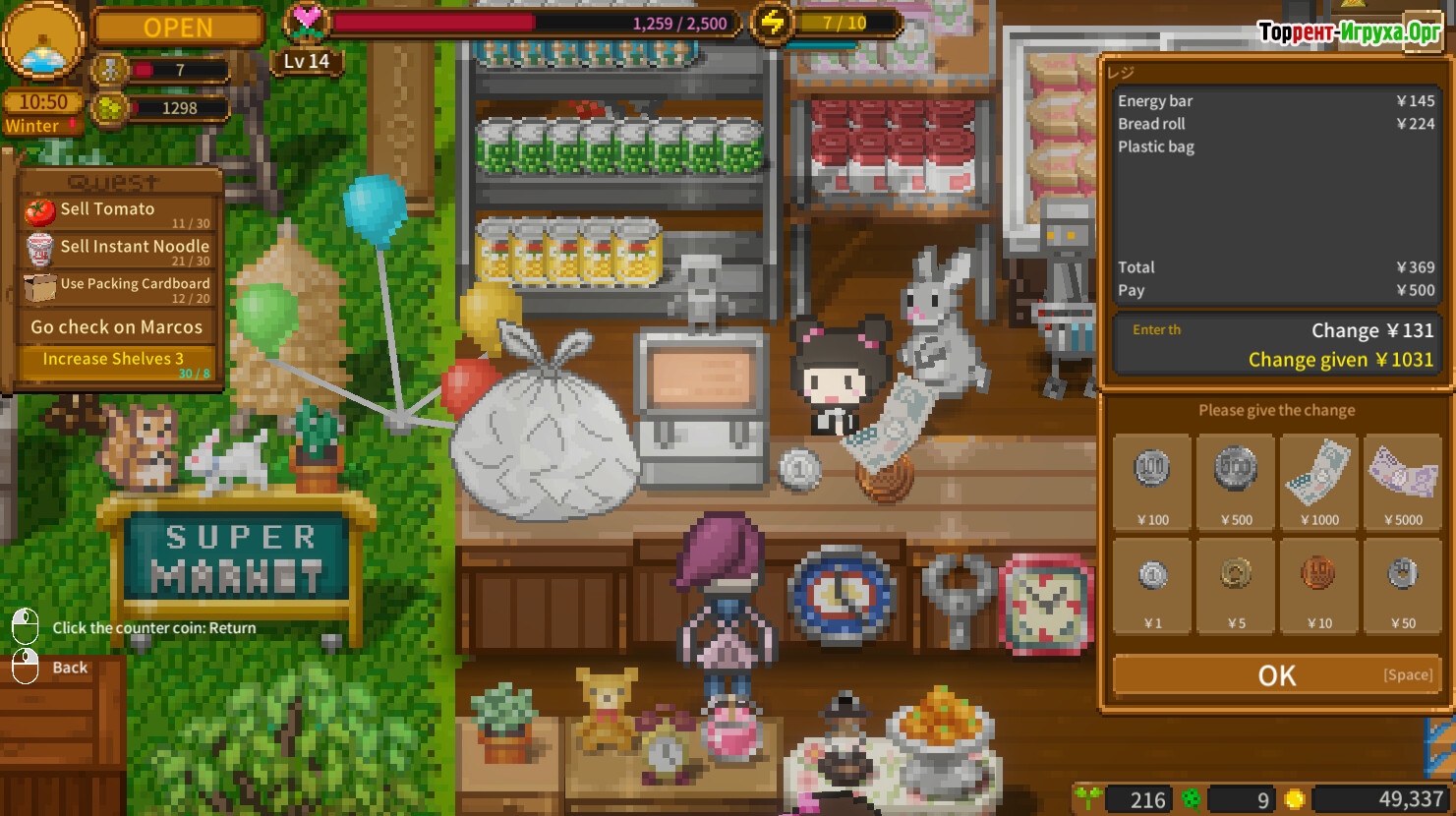 Обрабатывайте покупки за кассой, принимая оплату в непривычных формах — от цифровых карт до экзотических предметов, характерных для будущего. Внимательно следите за запасами и динамикой продаж, ведь даже в условиях исчезающей цивилизации торговля остаётся способом объединения самых разных существ под одной крышей.