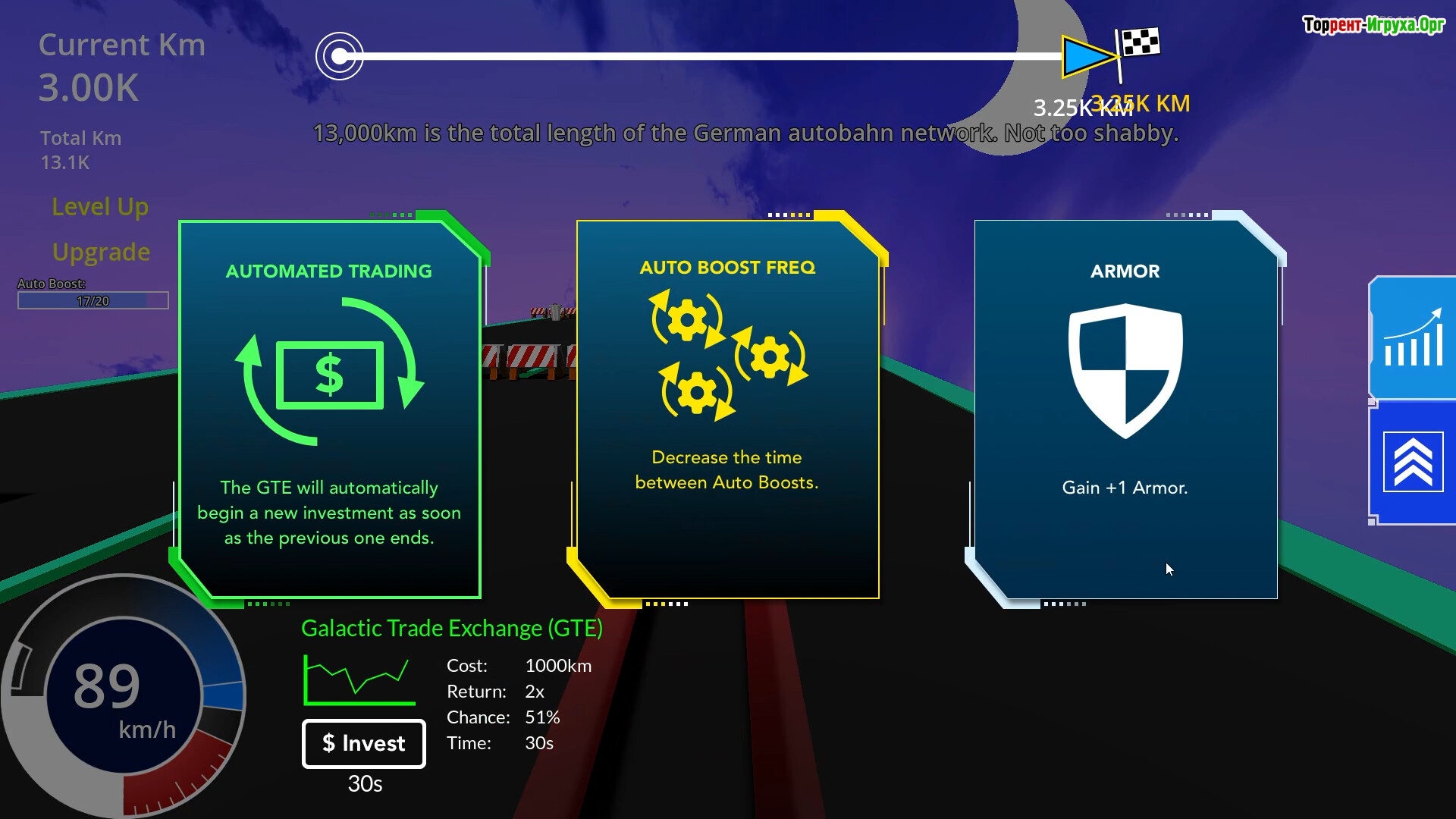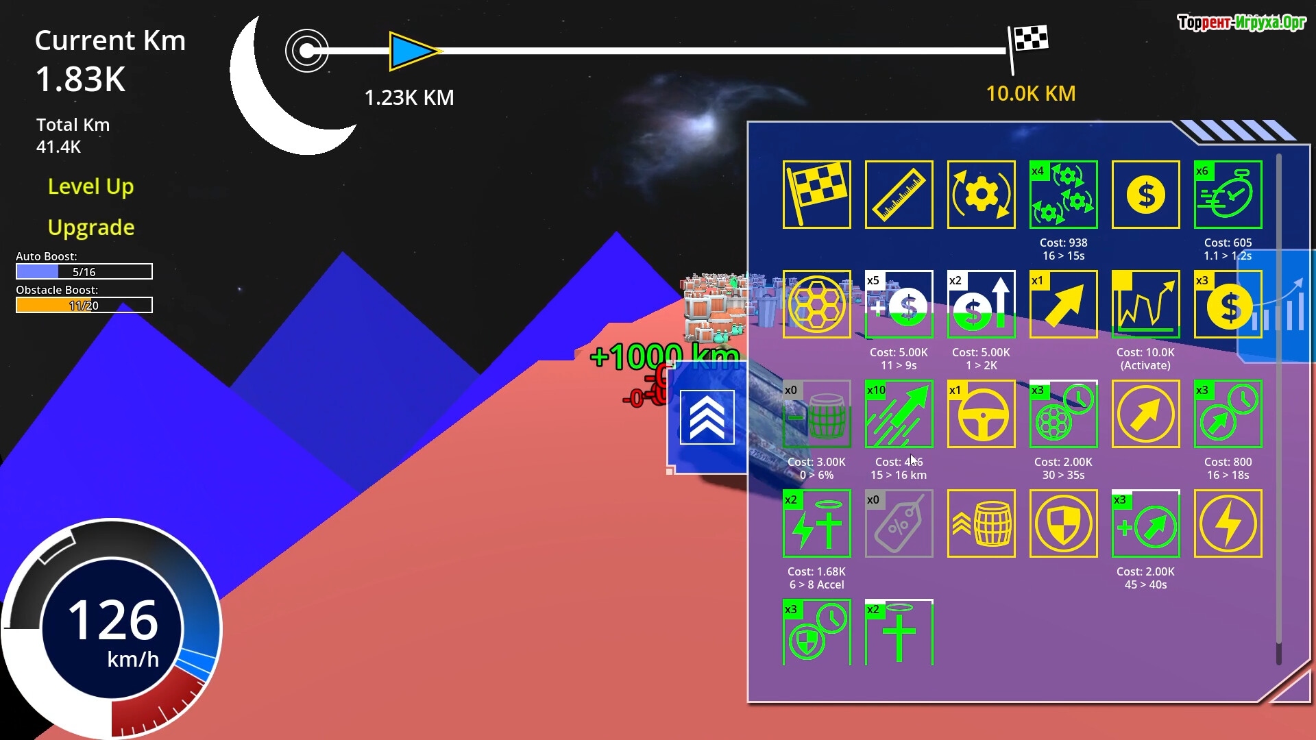 Каждый преодолённый метр приносит очки прокачки, которые можно направлять на улучшение скорости, брони и маневренности. Игра позволяет как вручную активировать апгрейды, так и автоматизировать процесс, чтобы игрок мог сосредоточиться на управлении машиной. Выбирайте между активными билдами или стройте сложные пассивные цепочки усилений, подстраивая стиль под собственные предпочтения.
