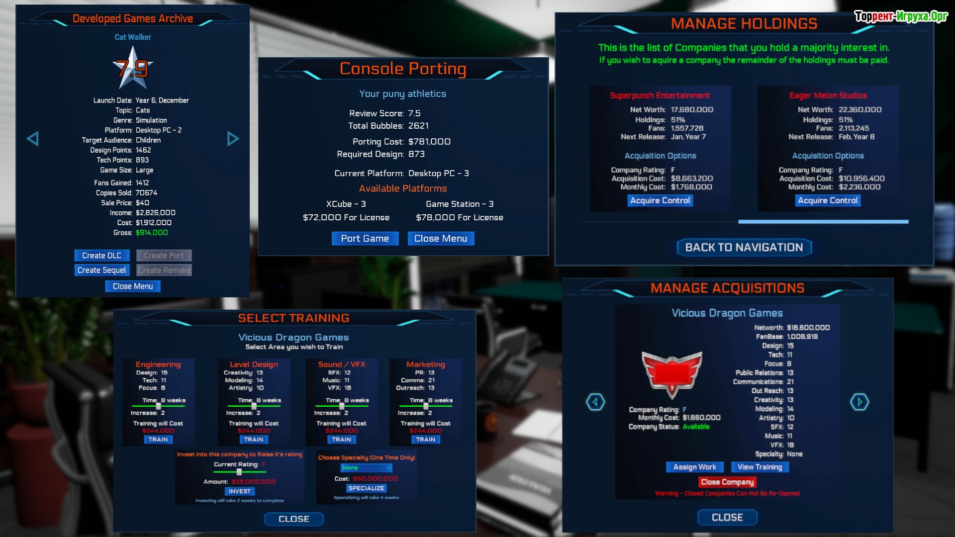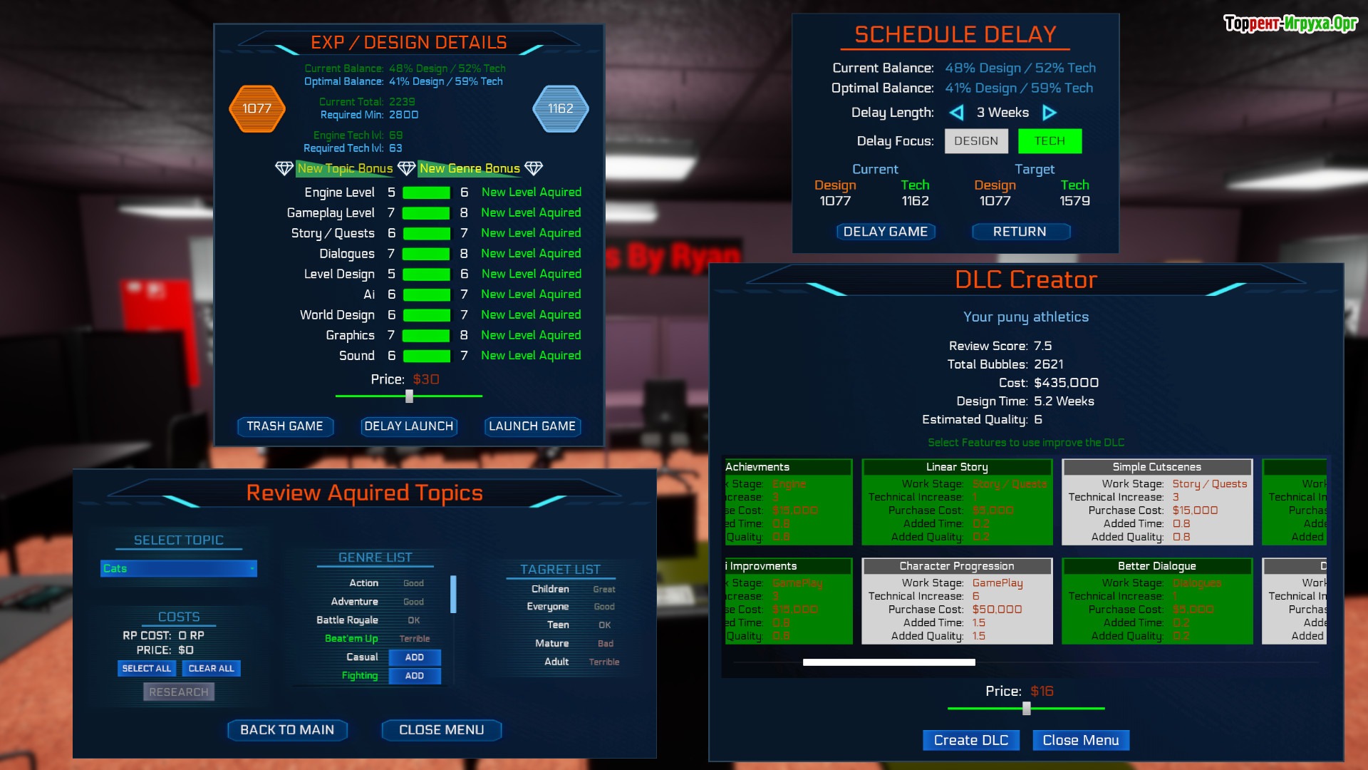 Процесс разработки в игре выглядит интуитивно понятным: перед началом нужно определить бюджет, выбрать тематику игры и сфокусироваться на ключевых аспектах, будь то технологии или геймплей. Разнообразие тематик позволяет экспериментировать и влиять на результат. Помимо этого, игроку предстоит заниматься управлением сотрудников, их обучением и финансированием. Чтобы испытать все возможности проекта на ПК, достаточно скачать торрент Game Dev Masters и погрузиться в мир создания виртуальных хитов.