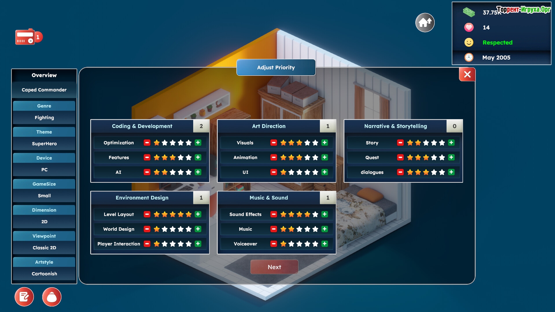 Game Builder Tycoon предлагает глубокое управление студией, позволяя курировать проекты вплоть до мелочей: задания, уровни, визуальное оформление и функционал. Настраивайте задачи для сотрудников, выбирайте тематику и стиль игры, создавая уникальные продукты на рынке.