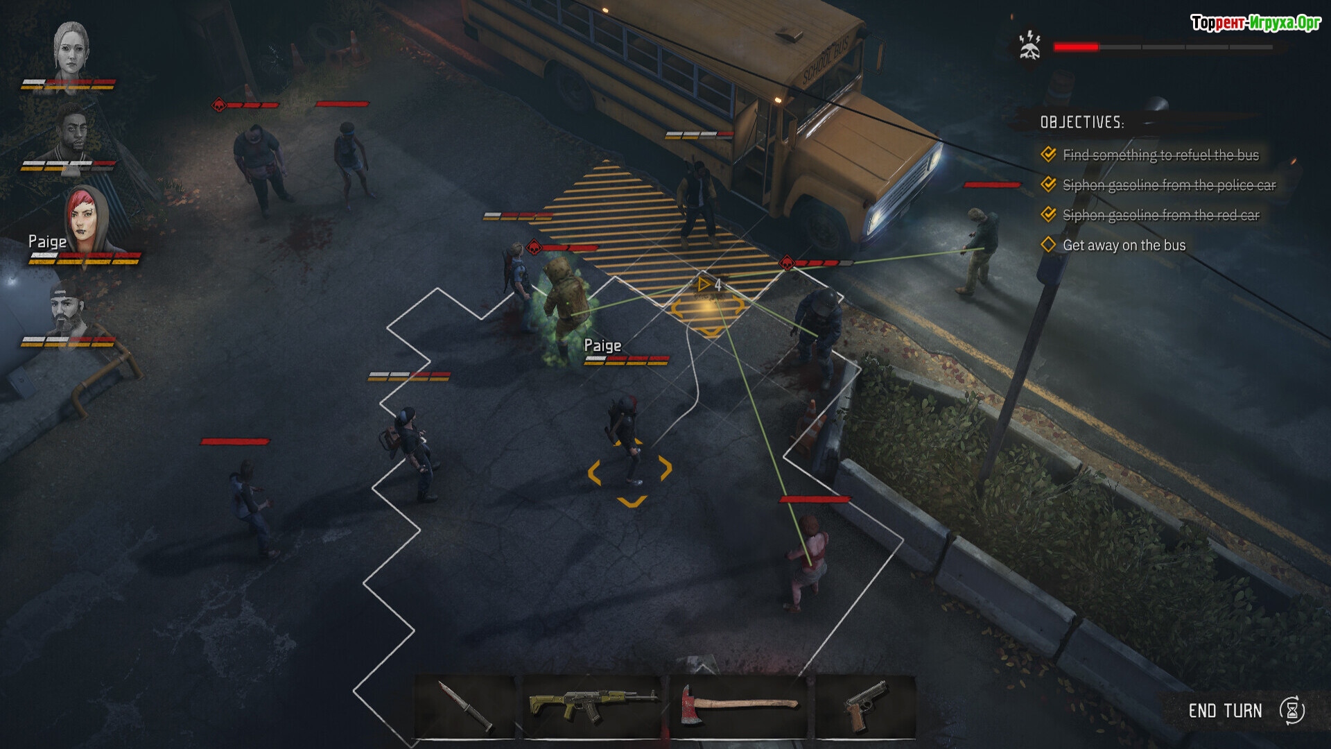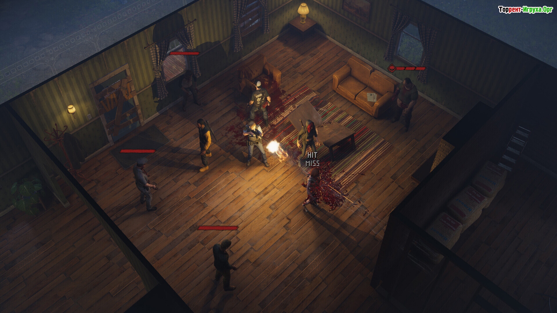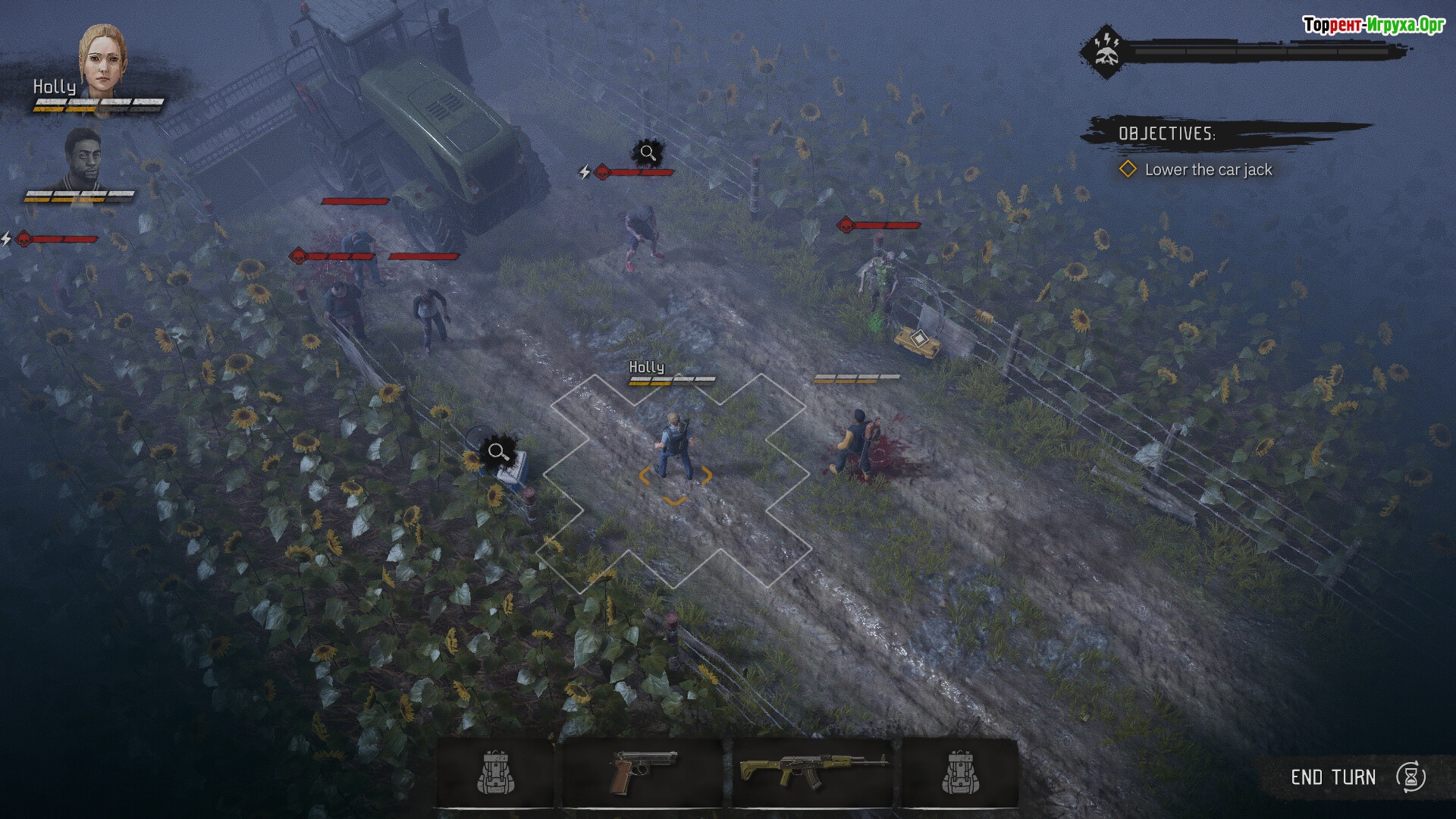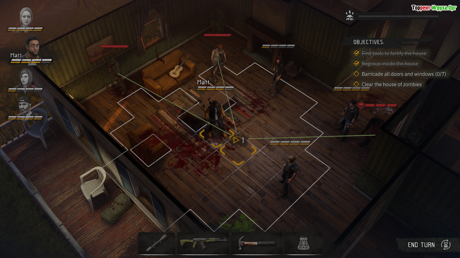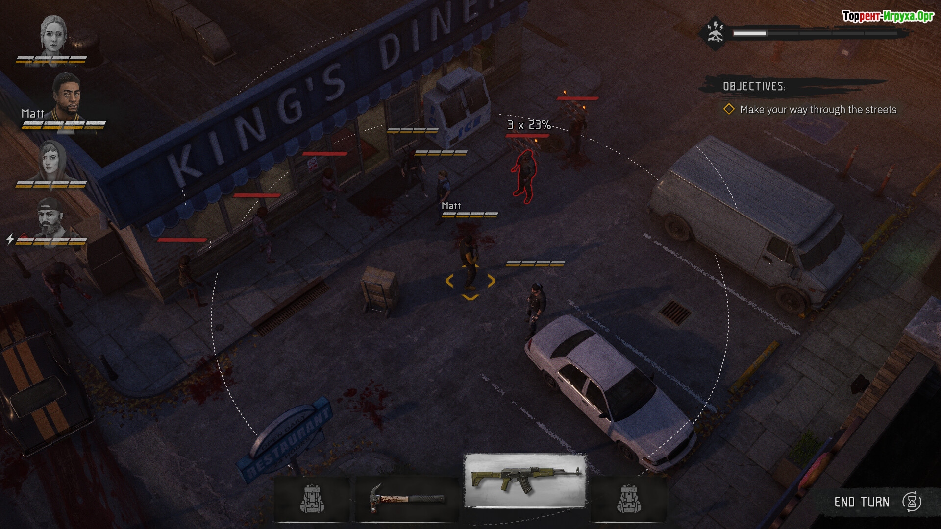 И да, тут есть знаменитые шансы на попадание: Калаш 40%, Дробовик 90% + бьет конусом, заточка 60%, кинуть банку 50% и да зомби тоже могут промазать по вам рукопашкой. Патроны как бесконечные, перезарядка 1 очко действия.