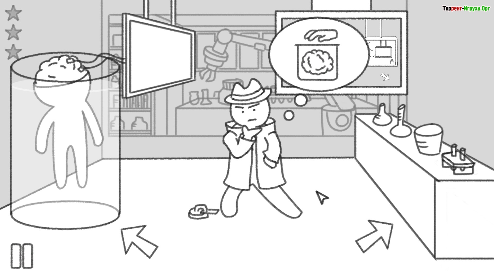 Особое внимание в игре уделено визуальному стилю: простая, но выразительная черно-белая графика подчеркивает атмосферу задумчивости и интеллектуального поиска. Захватывающее и динамичное повествование поддерживает интерес на протяжении всей игры, объединяя философские эксперименты с элементами игрового веселья.
