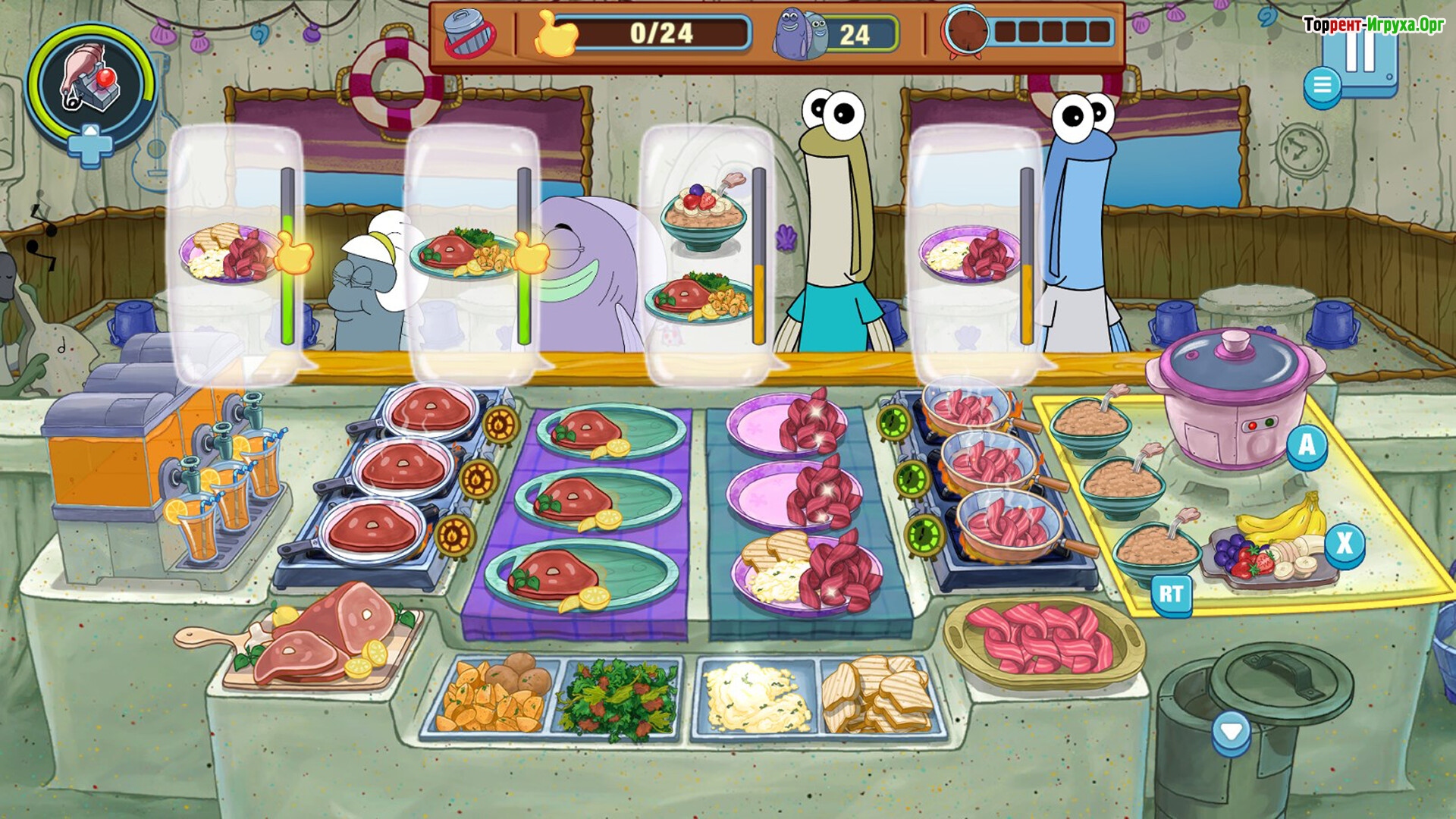 SpongeBob: Krusty Cook-Off от разработчика Entalto Studios — это захватывающий симулятор повара, в котором приготовление блюд превращается в настоящий праздник скорости и хаоса. В этой игре 2025 года игрокам предстоит сражаться с временем, жарить, подавать и украшать заказы быстрее, чем посетители успевают постучать по стойке, погружаясь в динамичную атмосферу кулинарного безумия.