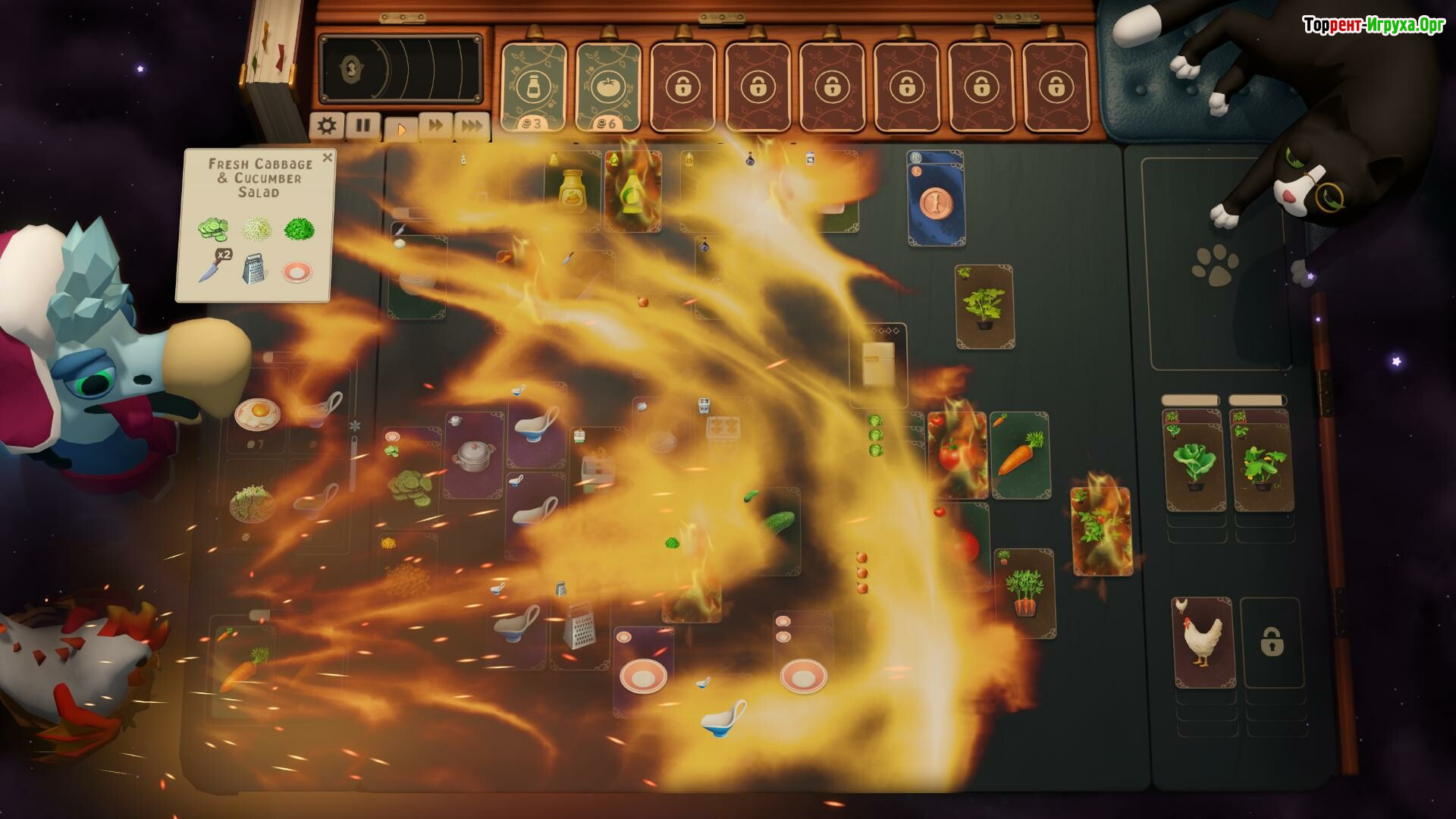 Карты в Abra-Cooking-Dabra выступают как алхимические символы, способные усиливать, нейтрализовать или изменять проявления других компонентов. Их правильно комбинируя, игрок обслуживает самых требовательных гостей. С ростом темпа рабочего процесса кухня буквально кипит, и каждое принятое решение приобретает критическое значение, ведь промедление может привести к кулинарному хаосу с взрывами и летящими тарелками.