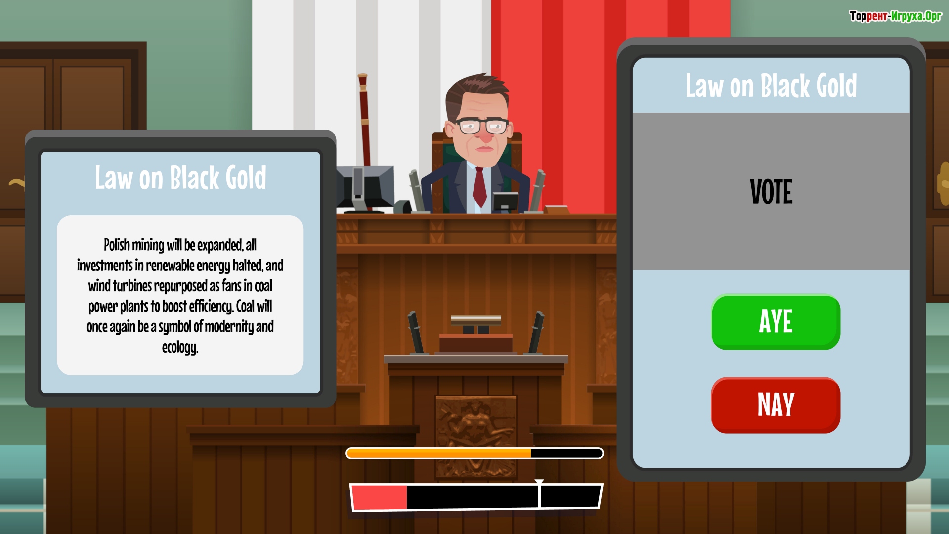 Разработанная компанией Simplicity Games и выпущенная в 2025 году, игра предлагает пошаговые дебаты, масштабные парламентские арены и систему союзников, основанную на карикатурных образах реальных политиков. Юмор без цензуры и остроумная критика всех политических лагерей делают этот проект настоящим отражением современного политического хаоса.