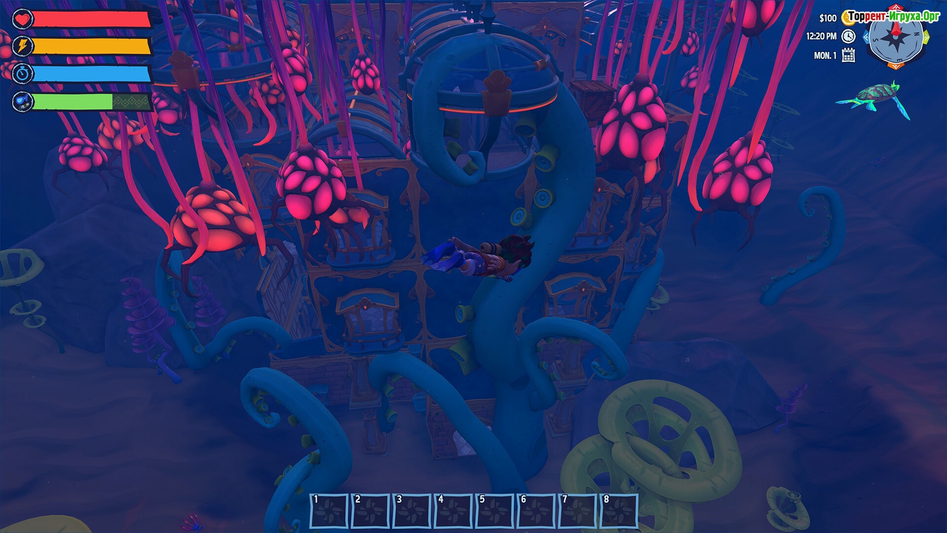 Как и в Портии, тебе надо бегать туда-сюда, по поручениям жителей и восстанавливать остров, приглашая на него новых жителей. Но так как у нас тут "островная тематика", тебе придётся нырять, ОЧЕНЬ МНОГО НЫРЯТЬ! Ну и изучать подводные локации на предмет ценностей. А от Dysmantle тут механика разбора предметов, когда нужно разобрать определённое кол-во, чтобы открыть схему рецепта разбираемого предмета.