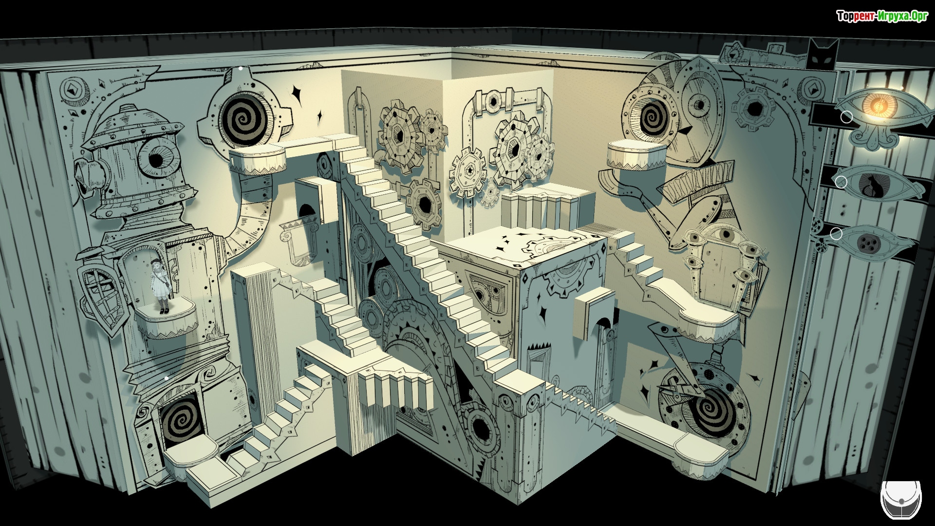 В ходе путешествия по таинственному зданию предстоит активировать разнообразные механизмы, включая огромного робота и сложные шестеренки, которые помогут запустить цепочку процессов. Игра погружает в стилизованный мир, наполненный визуальными контрастами и звуковым сопровождением, где каждая деталь имеет значение.