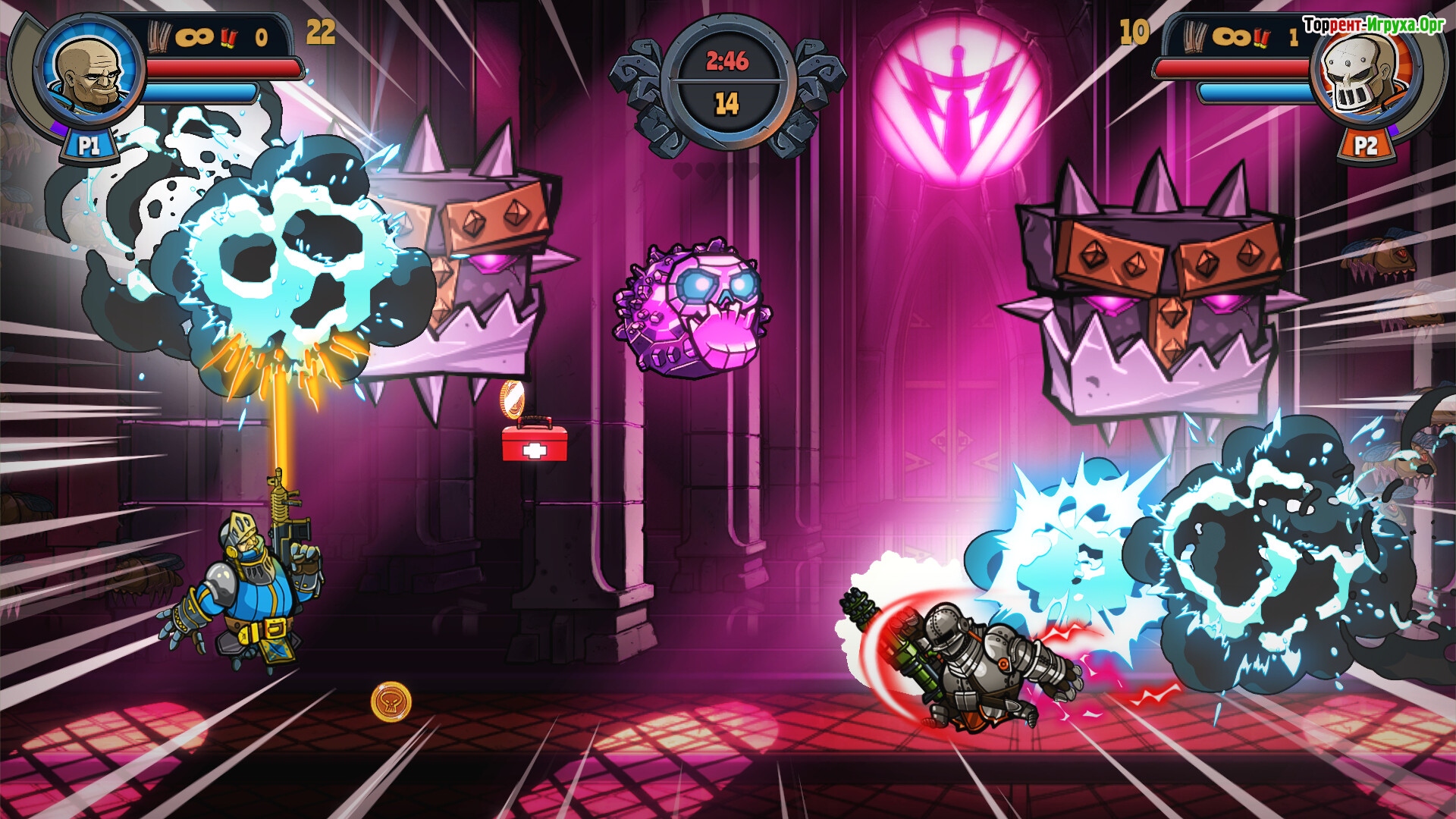 Игра выделяется динамичными сражениями с могучими боссами и поддержкой кооперативного режима, который позволяет соревноваться и сражаться вместе с друзьями. В Knights & Guns представлено около 150 уникальных уровней, что делает игровой процесс разнообразным и увлекательным как для одиночного прохождения, так и для совместных приключений.