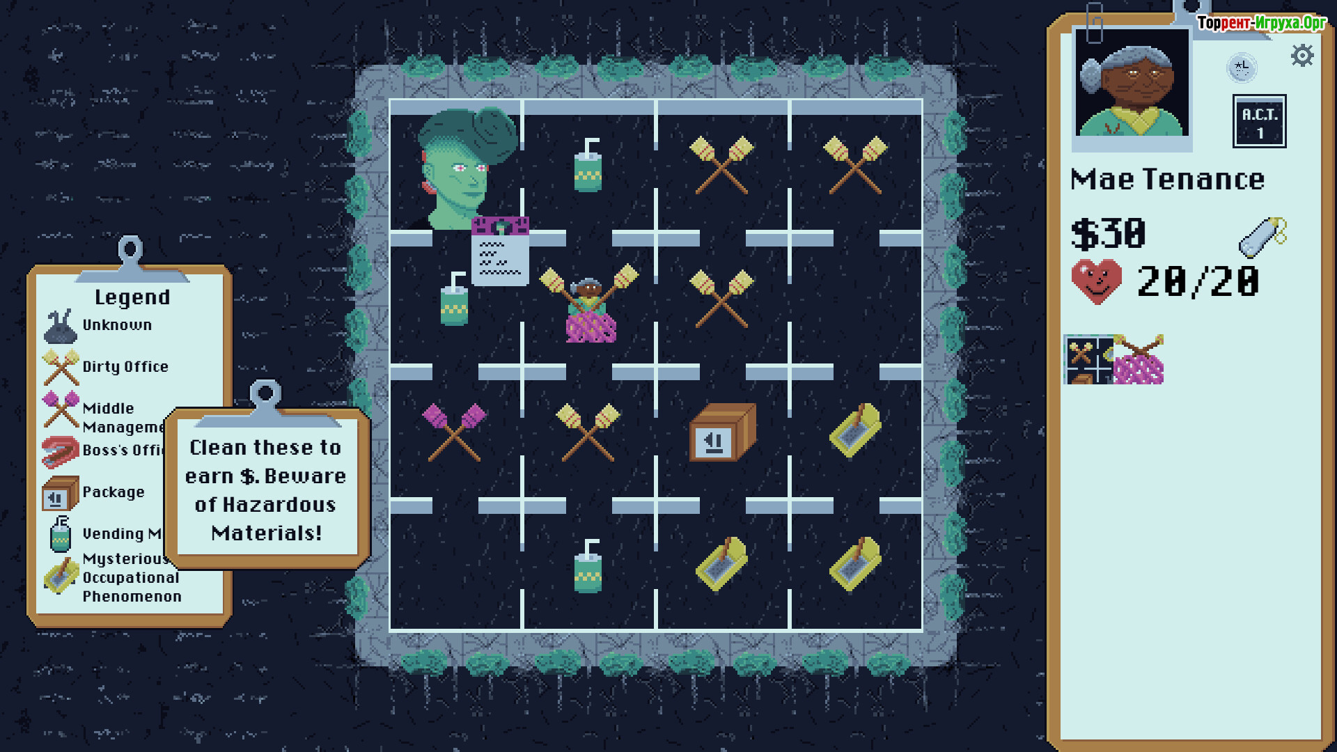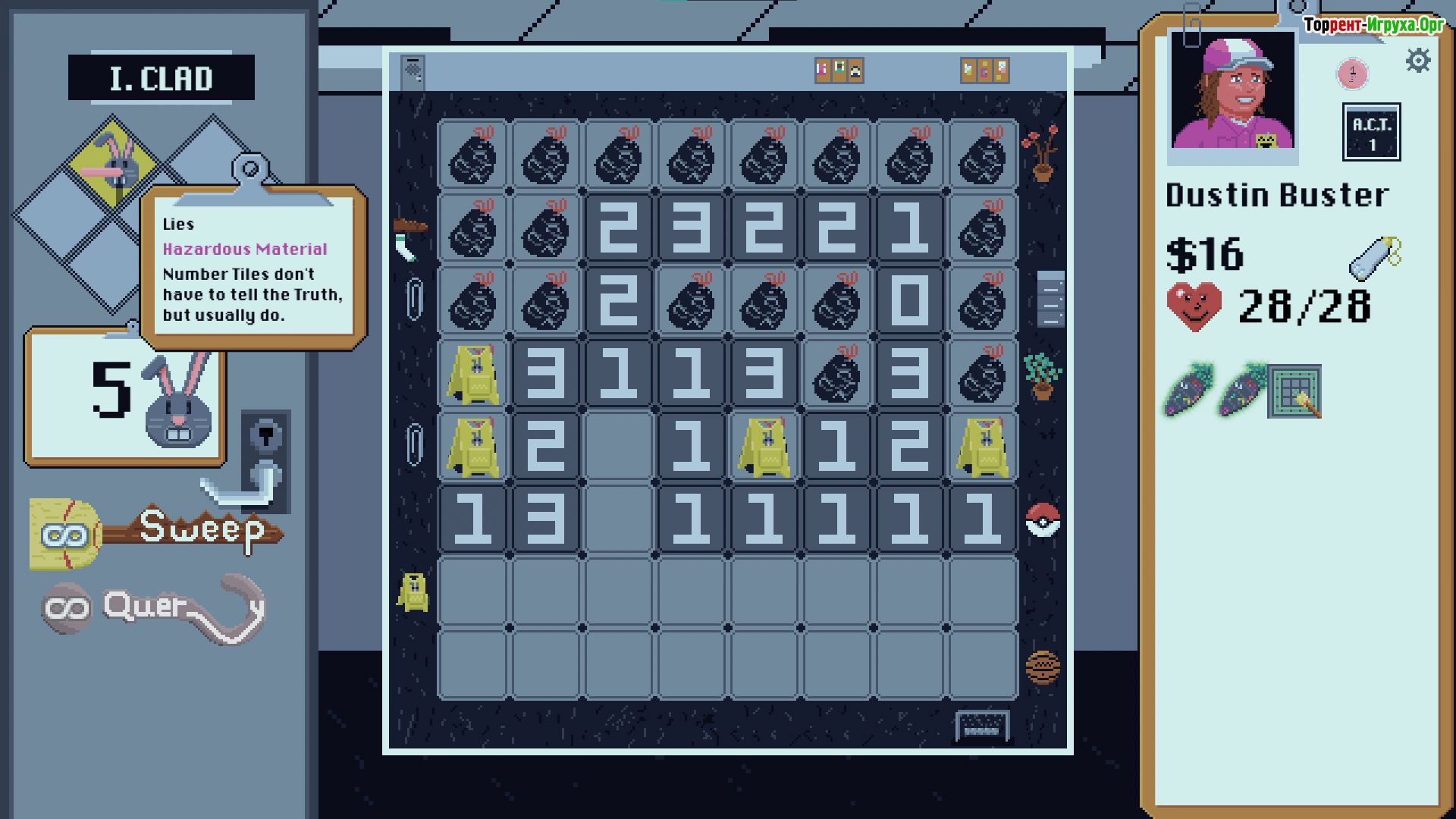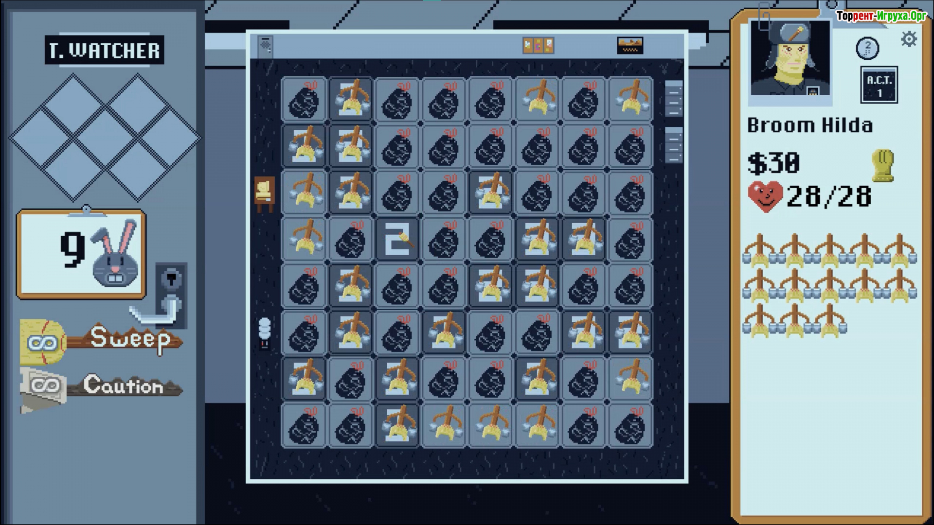 BroomSweeper от разработчика BandsWithLegends, созданный в 2026 году, представляет собой уникальный гибрид классического «Сапёра» и roguelike, где игрок оказывается на ночной смене уборщика в штаб-квартире мегакорпорации. Внешне это рутинная работа, но постепенно игра превращается в напряжённый кошмар, где каждая плитка скрывает опасность, а уборка становится настоящей борьбой за выживание и удержание позиции.