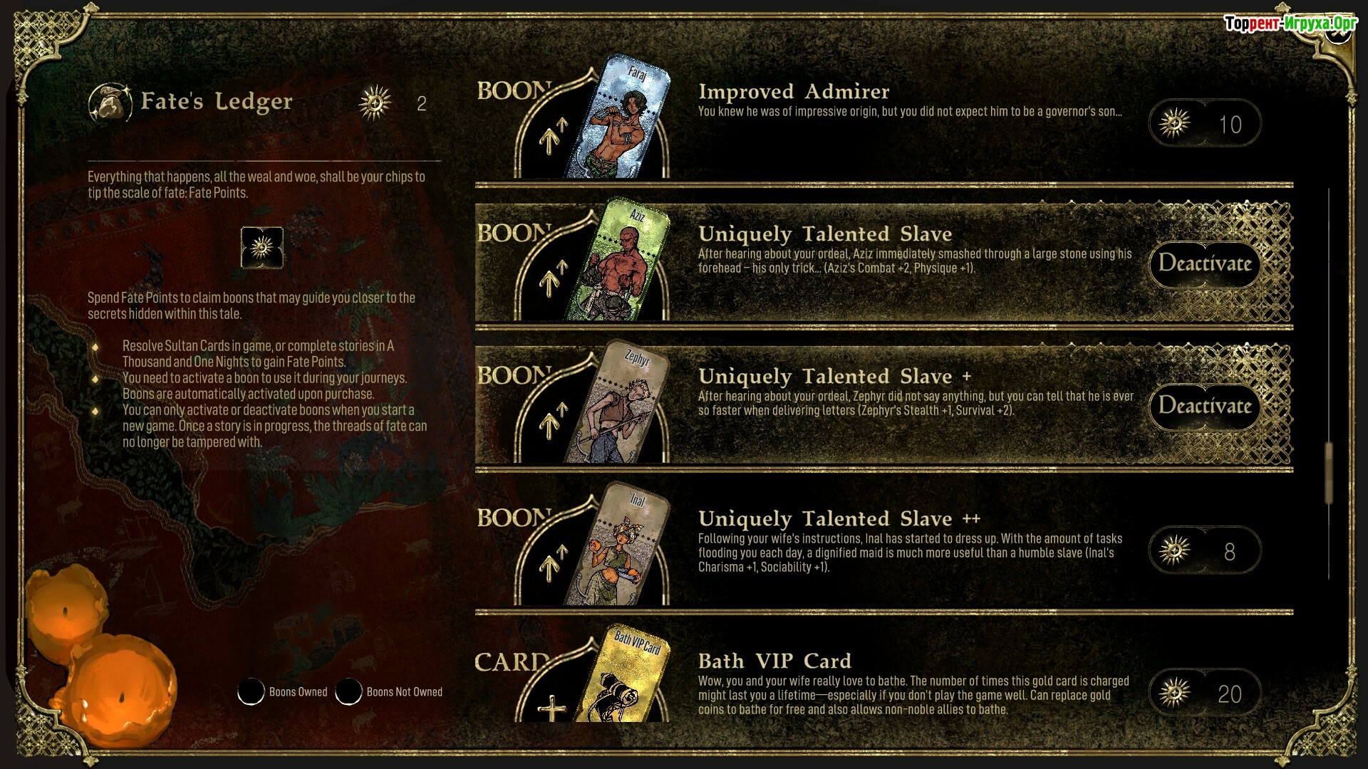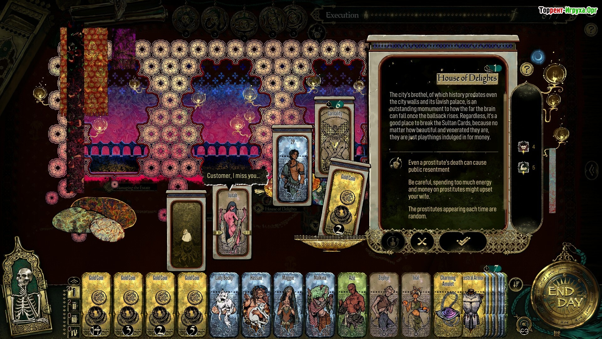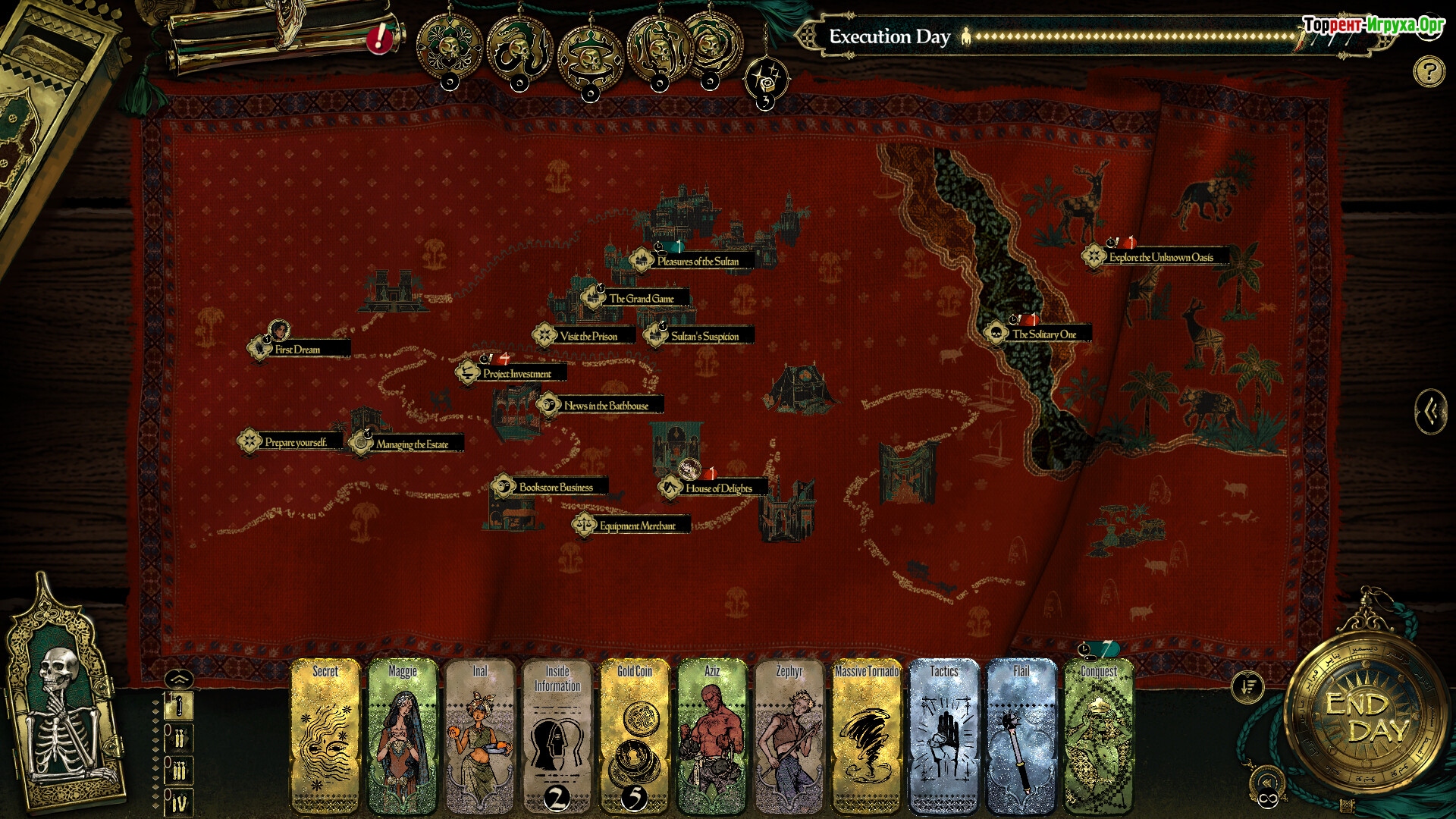 Каждая из карт султана представляет собой уникальное испытание на выживание. Карта "Похотливость" заставит вас удовлетворять капризы султана, "Расточительность" потребует больших трат ресурсов, а "Завоевание" отправит вас в рискованные экспедиции. Наиболее кровавой является карта "Кровопролитие", где придется принимать судьбоносные решения между жизнью и смертью. Эти испытания наполняют игру глубокими моральными дилеммами.