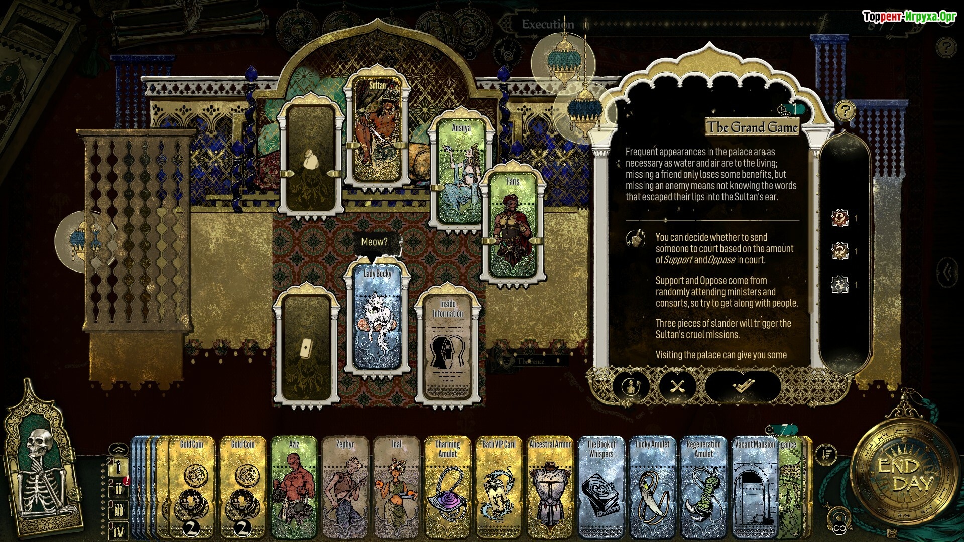 Sultan's Game — это увлекательная игра, созданная разработчиком Double Cross, которая погружает игроков в суровый мир жестоких политических интриг. Вы выступаете в роли одного из министров султана и вынуждены участвовать в его коварных играх каждую неделю, когда вытягивается одна из четырех карт. От выбранной карты зависит ваше задание, полное опасностей для жизни и репутации.