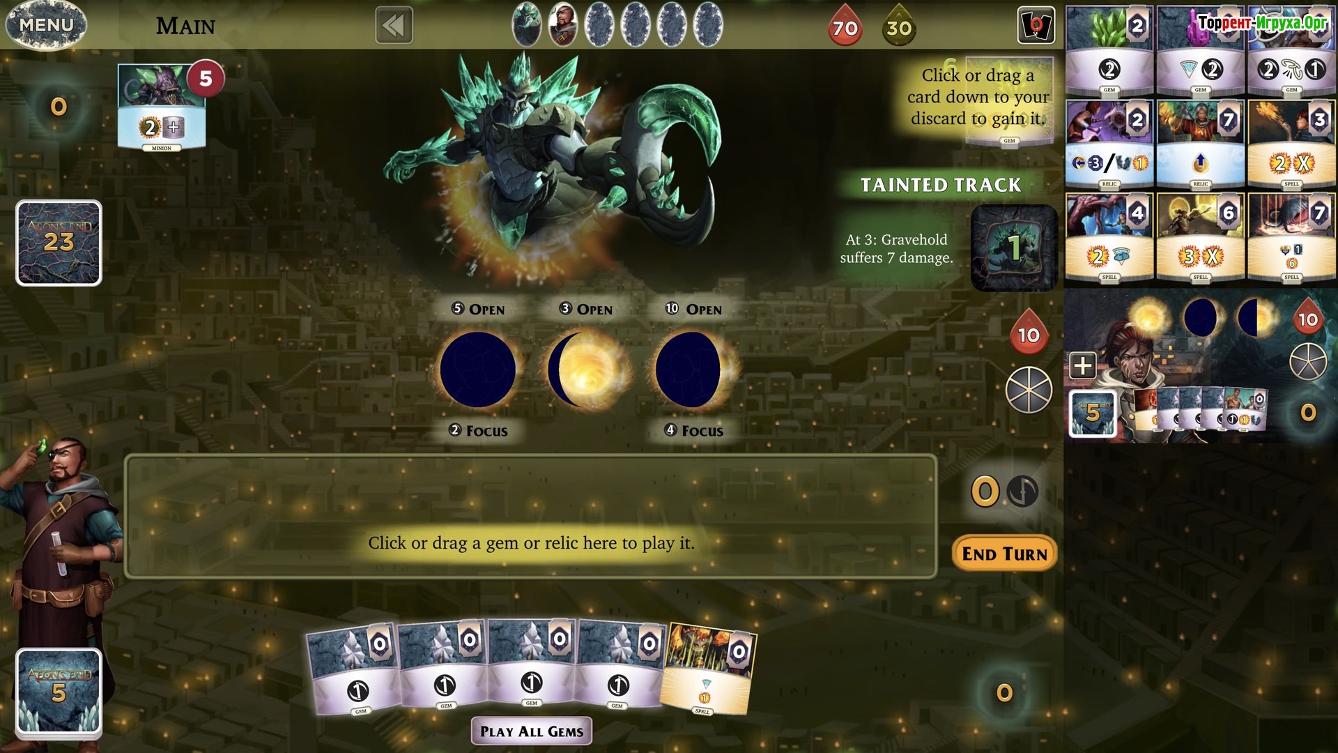 Aeon's End — это компьютерная версия популярной настольной игры, разработанная Handelabra Games Inc. и выпущенная в 2019 году. В этом карточном батле с элементами стратегии и приключения игроки погружаются в атмосферу постапокалипсиса, где им предстоит защищать последний оплот человечества — город Грейвхольд. Проект позволяет играть как в одиночном режиме, так и в многопользовательском формате, предоставляя возможность сформировать уникальную команду магов с разнообразным набором способностей.