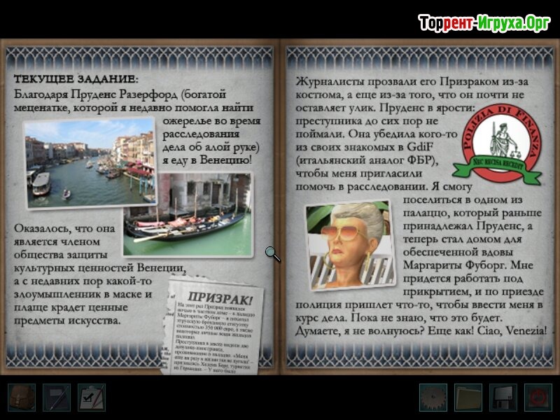 В процессе игры вам встретятся яркие и колоритные жители Венеции, которые помогут или запутают следствие. Ваша задача – остановить серию краж ценных артефактов, ведь полиция уже близка к тупику. Воспользуйтесь возможностью создавать собственные маскировки и модные наряды, а удовольствие добавит возможность сыграть в традиционную итальянскую карточную игру Scopa. Приобрести дополнительные ресурсы поможет творческий подход к зарабатыванию денег, а атмосферу дополнит пение гондольеров, наполняющее каналами волшебством настоящей Венеции.