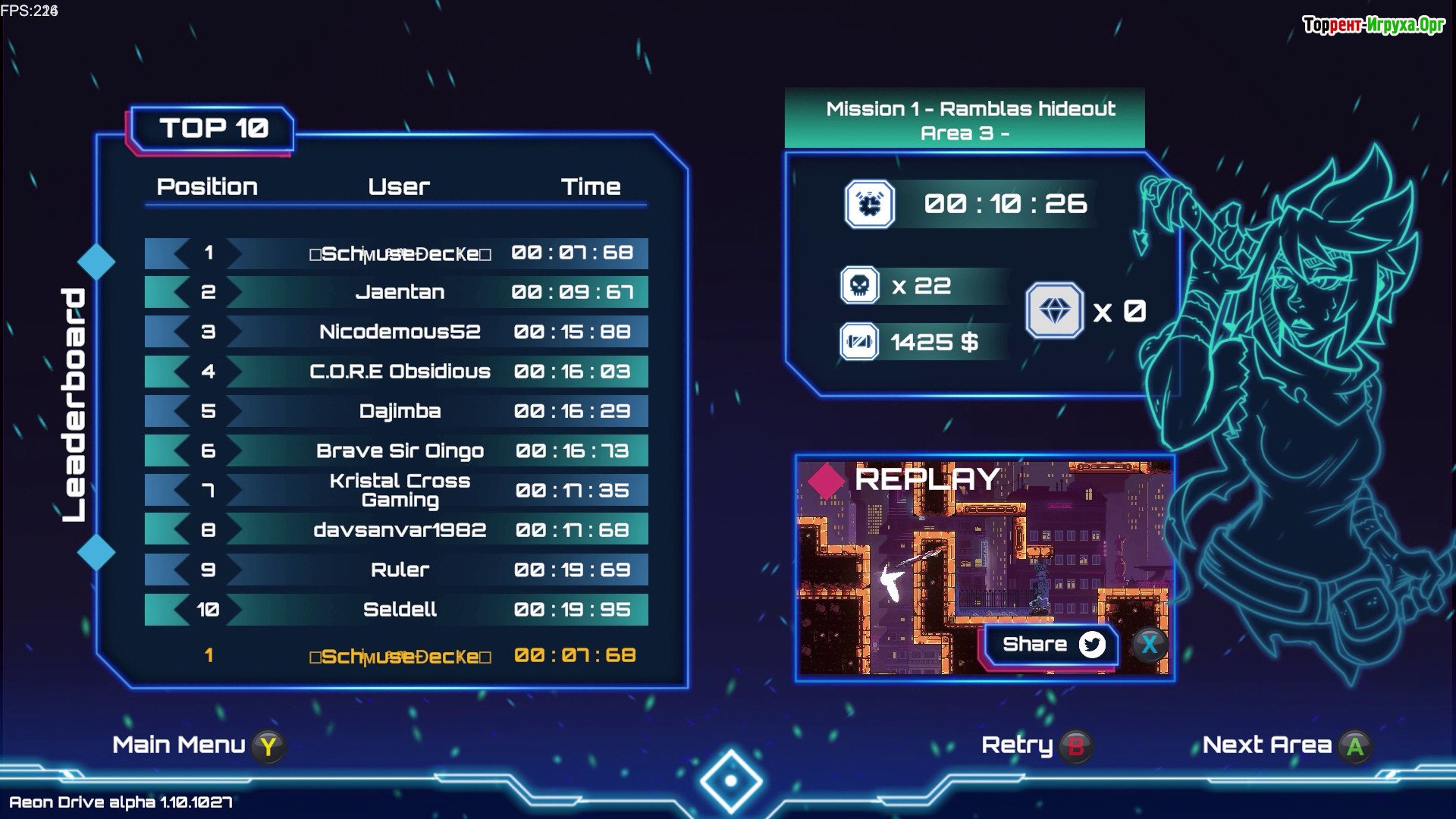 Игра выделяется своими особенностями: необычной механикой с элементами контроля времени, атмосферой киберпанка и многообразием опасных врагов, испытаний и временных ловушек. Эти элементы делают Aeon Drive захватывающим приключением для любителей динамичных и нестандартных аркад.