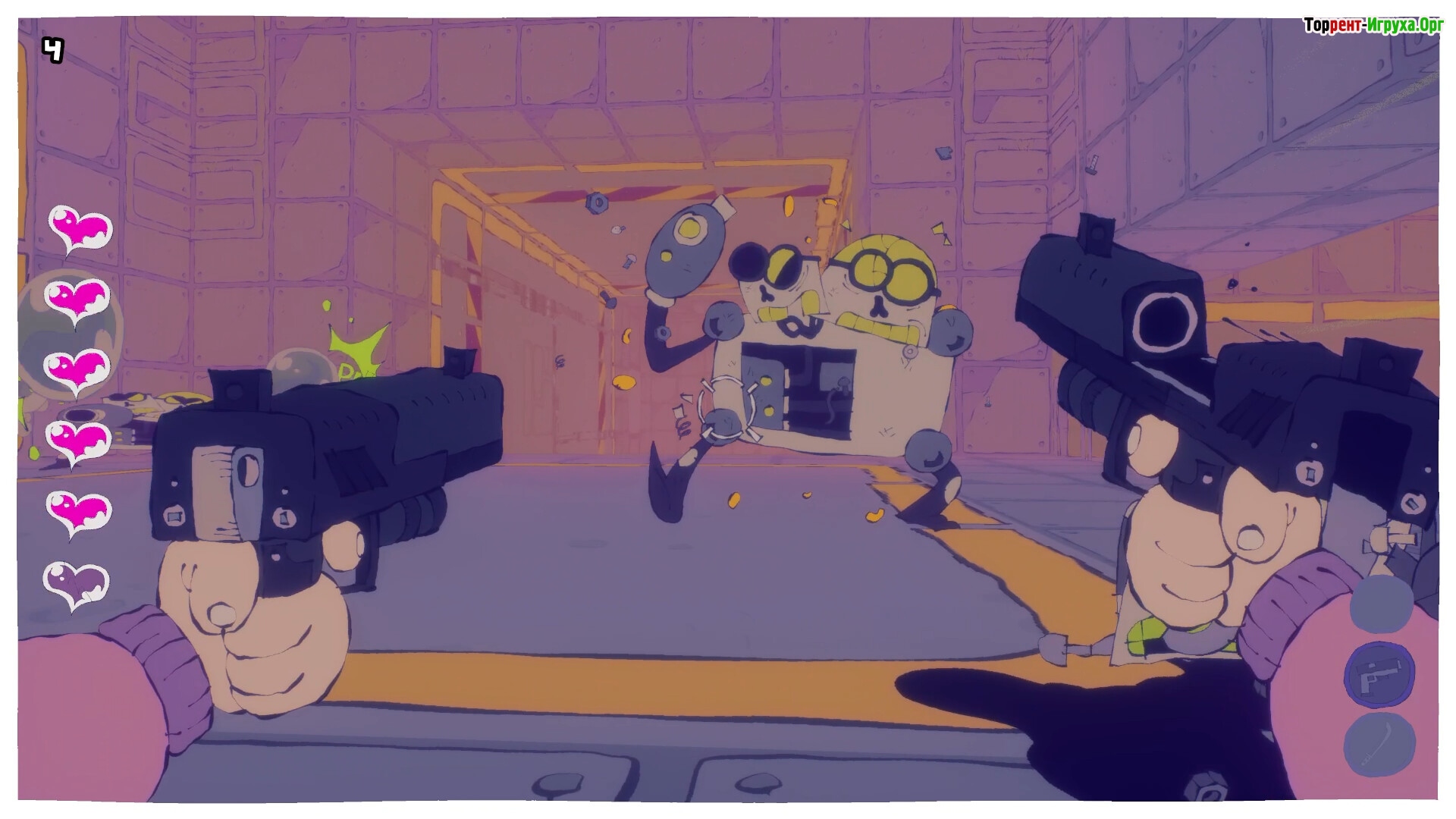По мере прохождения игрок сталкивается с причудливыми боссами, необычными кат-сценами и абсурдными ситуациями, которые заставляют улыбаться и удивляться. Улучшение оружия помогает преодолевать преграды на пути сквозь этот ярко нарисованный мир, где логика уступает место веселью и гротеску.