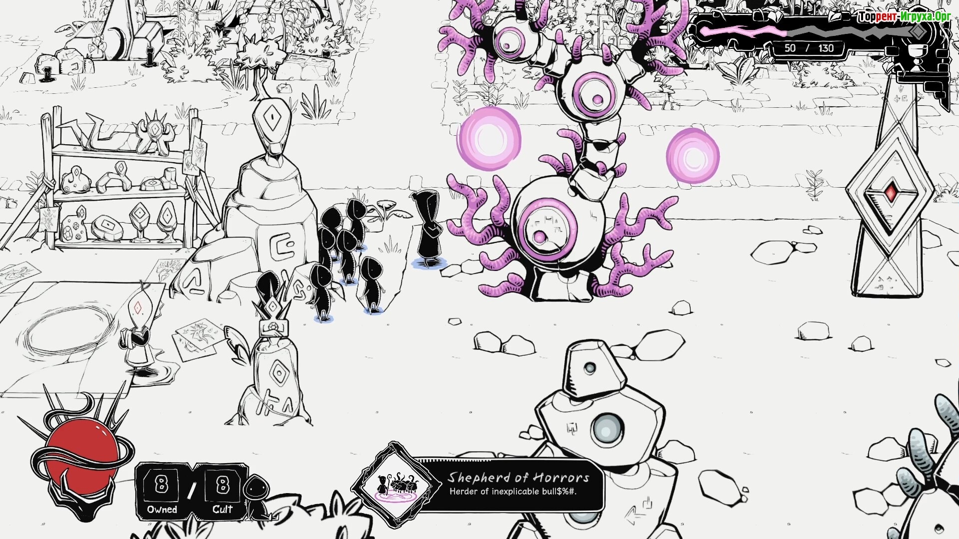 Исследуйте таинственный мир с его мрачными локациями и интригующими фракциями, стараясь выполнить волю коварного божества. Приумножайте преданность местных жителей, постепенно превращая их в послушных адептов, а вместе с растущей силой культа осваивайте кровавые церемонии и призыв могущественных сил, используя стратегические приёмы для решения сложных головоломок и боёв.