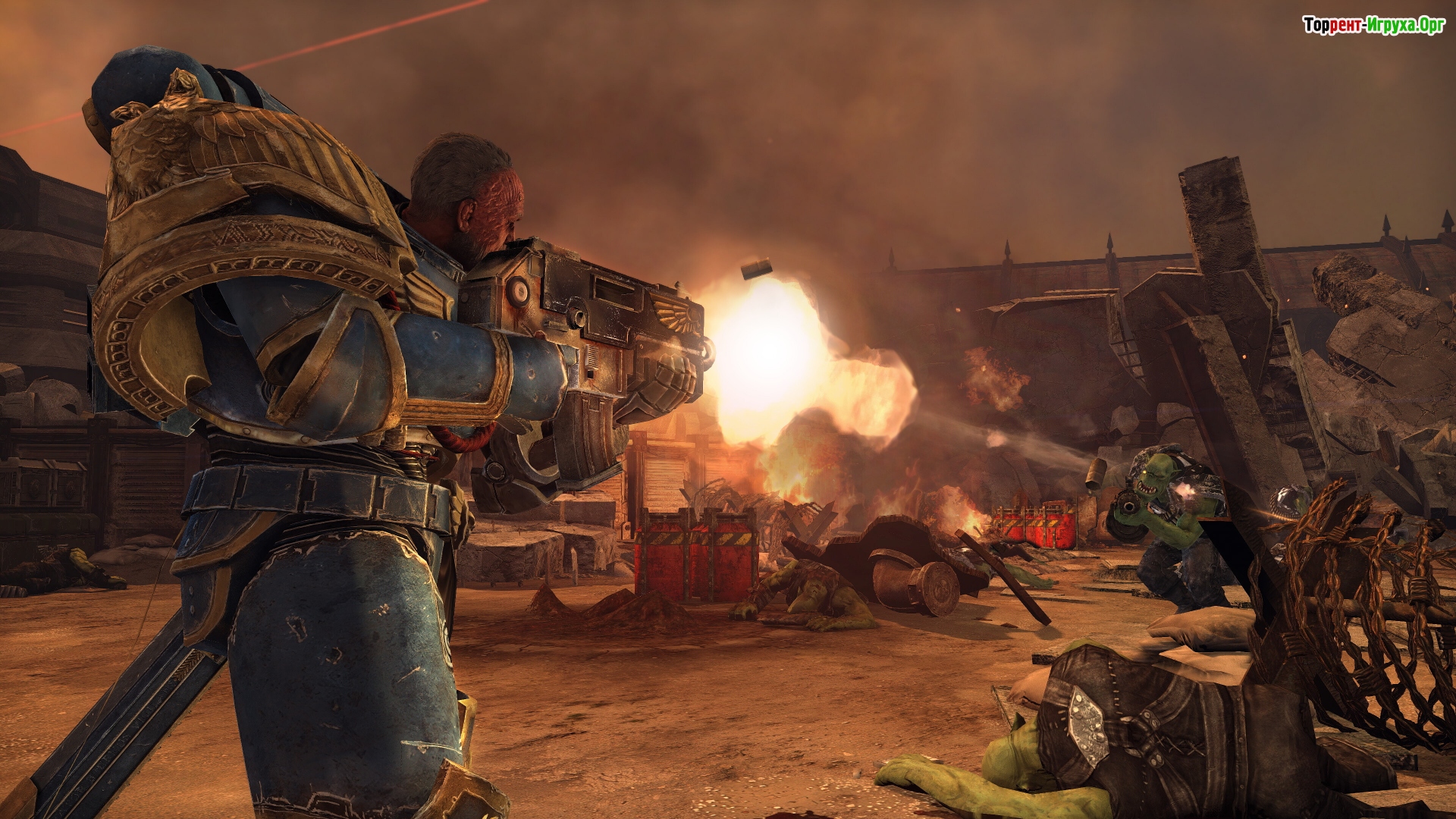 Вы выступаете в роли капитана Титуса, ветерана космодесанта из Ультрамаринов, ведущего защиту имперского мира-кузницы. Игра предлагает пройти через масштабные боевые зоны, сражаясь с ордой орков и применяя разнообразное оружие — от болтеров до цепных мечей — чтобы отбить атаки и удержать ключевые рубежи до прибытия подкрепления.