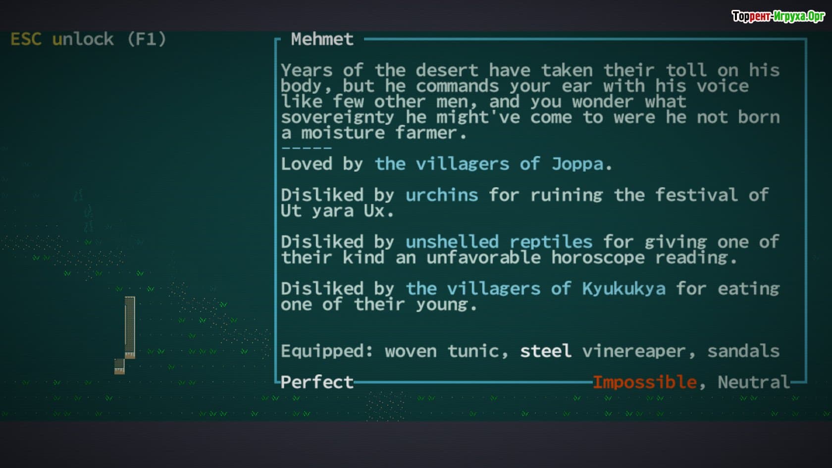 Caves of Qud — уникальное ретро-приключение, сочетающее элементы ролевой игры и стратегии. В этом масштабном мире вы сможете создать собственного героя, построить замок и собрать личную армию. Игра предлагает масштабную карту для исследования и почти безграничные возможности для развития персонажа, при этом стильная ретро-графика позволяет разработчикам из Freehold Games постоянно расширять контент и внедрять новые игровые механики.