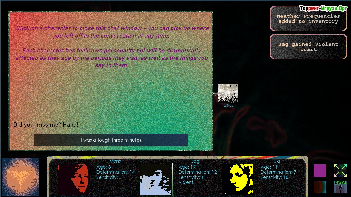Механика ускоренного взросления становится средством контроля над персонажами, которых отправляют через различные эпохи прошлого. Со временем дети меняются не только внешне, но и внутренне, сталкиваясь с травмами, соблазнами и откровениями. Игрок наблюдает за их трансформацией, пытаясь направлять развитие, хотя остановить ход времени невозможно.