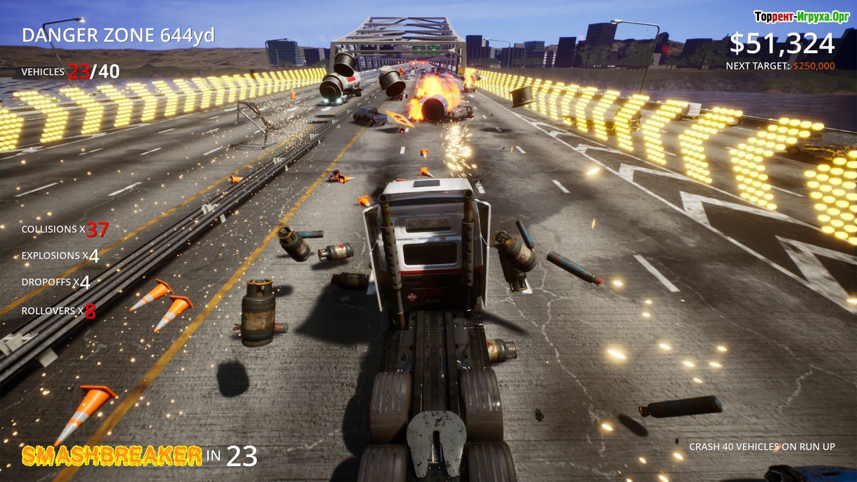 Игровой процесс предлагает непростой вызов — ситуация постоянно меняется, и понять всю картину сразу бывает непросто. Ваша задача — максимально разрушить доступные объекты, начиная с автомобилей и заканчивая большегрузами и взрывоопасными зонами, что запускает цепные реакции разрушений. Со временем адаптация к хаосу позволит вам улучшать результаты и достичь новых высот в разрушениях.