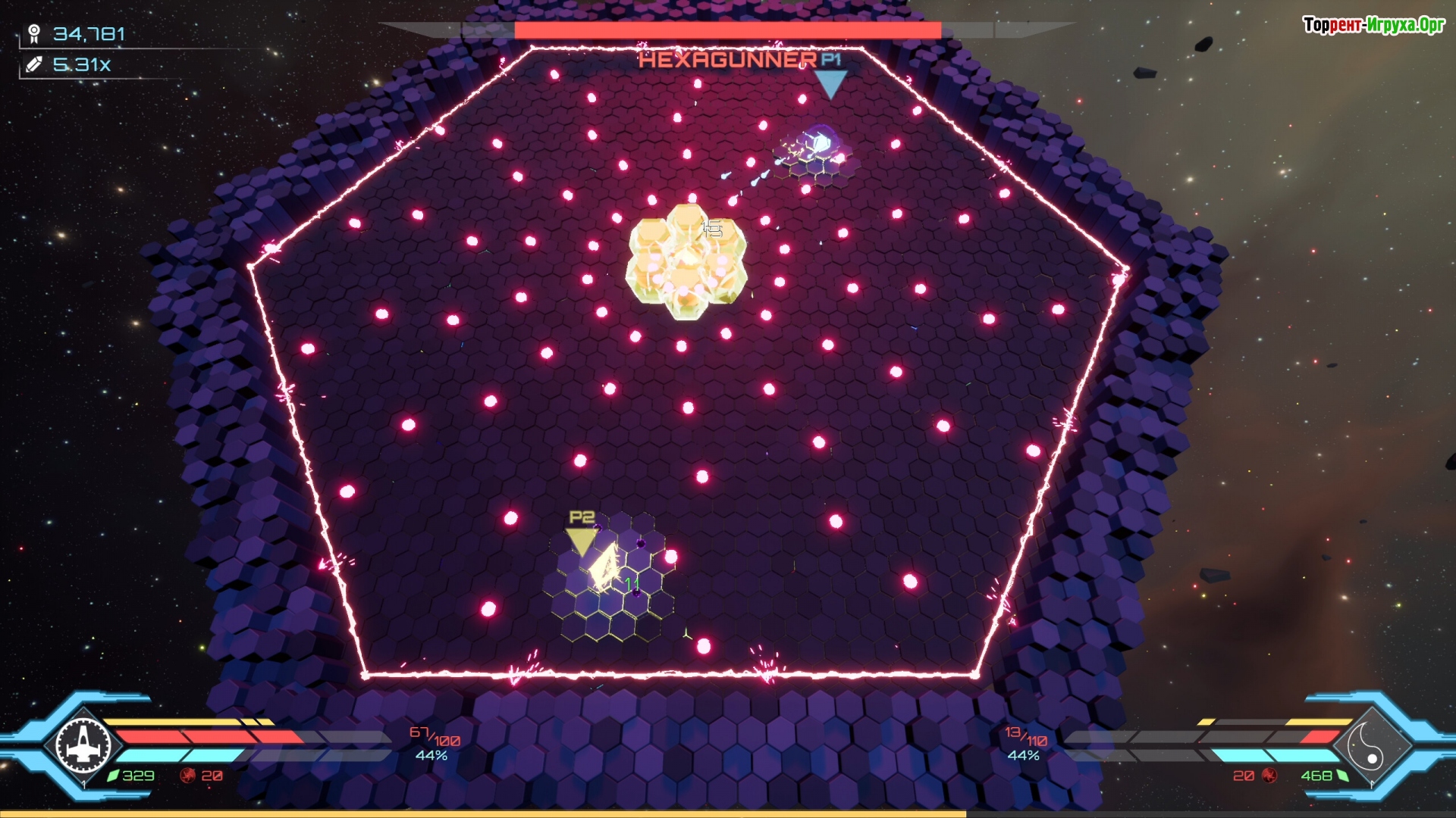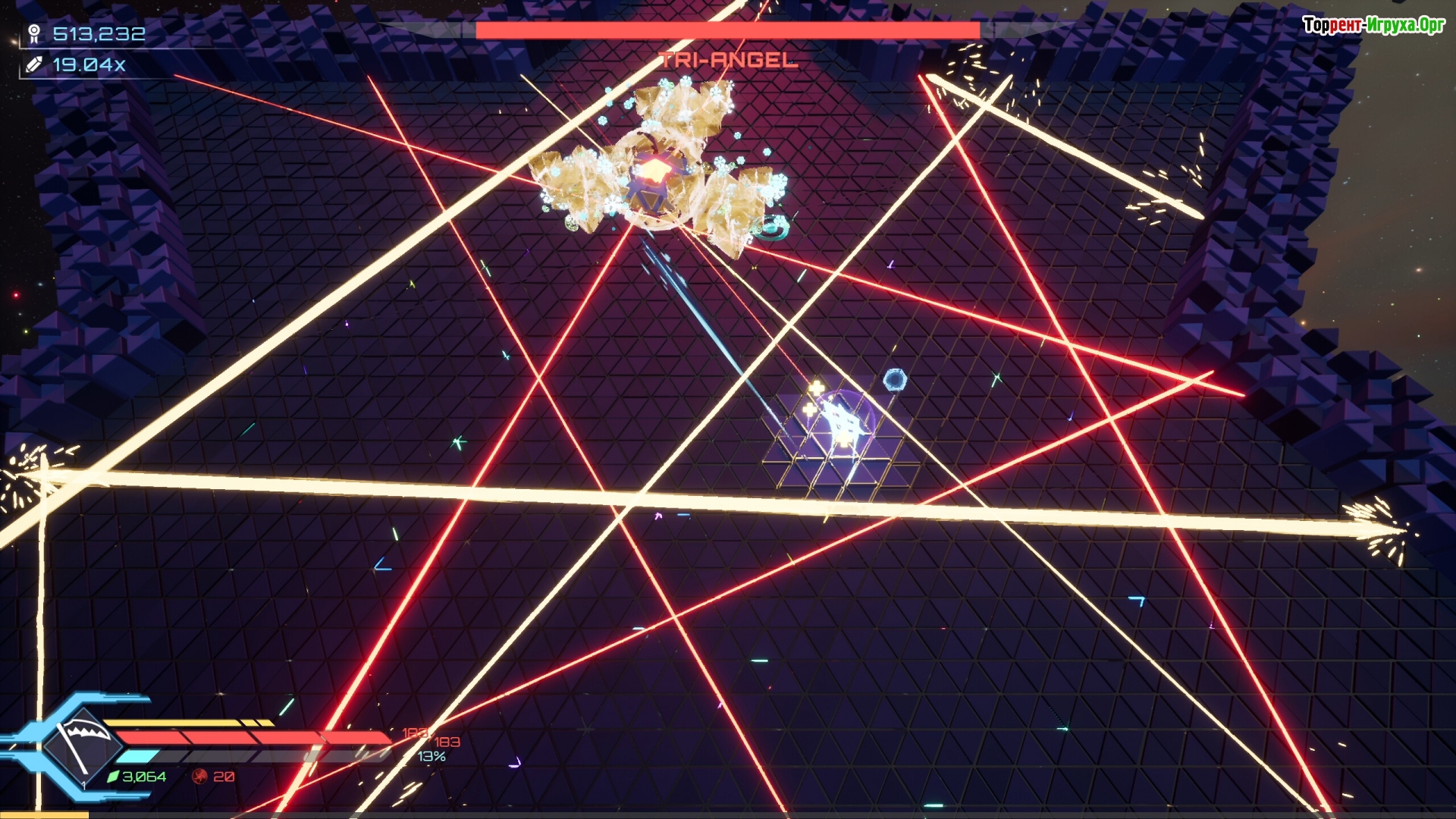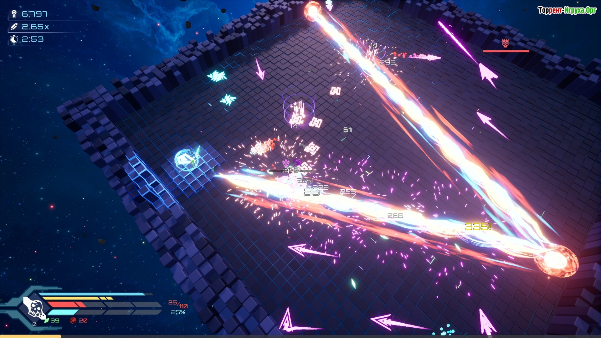 С ростом напряжения геометрические фигуры усложняются: окружение становится всё более ограниченным, модули вступают в конфликт, а построенные структуры разрушаются и рождаются заново. Всё это сопровождается визуальной музыкой — каждая форма и вспышка органично вписаны в общий ритм, подчёркивая настройку системы, а не сражение.