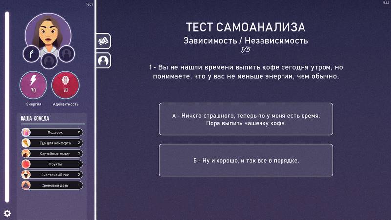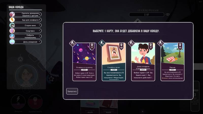 Neurodeck: Psychological Deckbuilder представляет собой увлекательную карточную игру в жанре коллекционной баталии. В ней вам предстоит погрузиться в сознание главной героини и столкнуться с различными чудовищами, используя разнообразные карточки с активностями. Изначально у вас будет ограниченное количество карт, поэтому размах маневров будет невелик. Однако по мере продвижения в игре вы откроете новые действия, что позволит вам постоянно корректировать свою тактику и стратегии. Важно помнить, что не следует брать все доступные карты, выбирайте только наиболее подходящие.