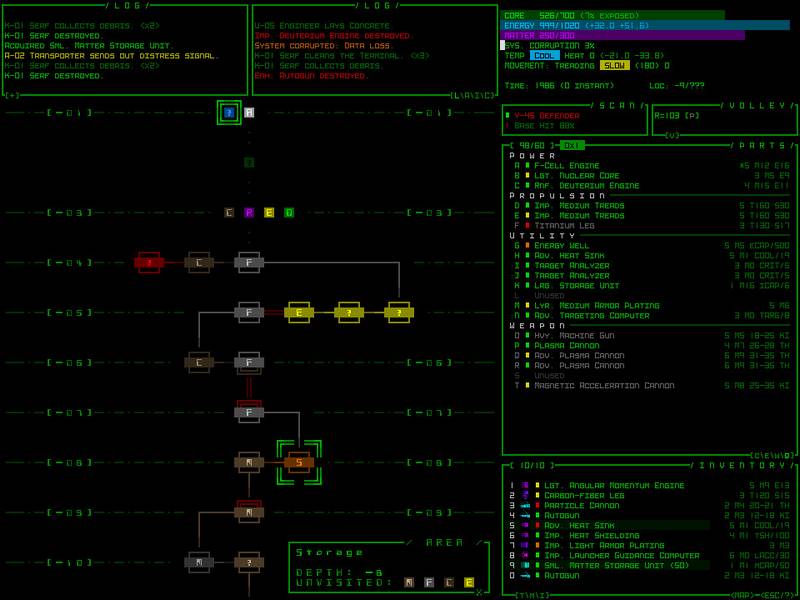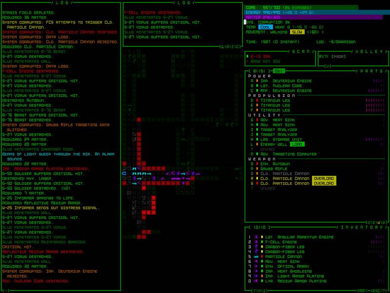 Игровой сюжет в "Cogmind" предлагает увлекательное пошаговое повествование, переплетающееся с элементами стратегических сражений, что обеспечит вам непередаваемое удовольствие. Благодаря использованию процедурного генерирования и инновационной визуализации, ваше приключение станет поистине уникальным и динамичным. Вам предстоит создавать робота, комбинируя различные детали, но для этого необходимо будет забирать недостающие компоненты у других.