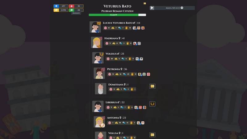 Игровой процесс в "Citizen of Rome - Dynasty Ascendant" позволяет вам погрузиться в повседневную жизнь римлян, изучая их обычаи и участвуя в различных мероприятиях. Вам предстоит отправиться на спортивные состязания, найти свою любовь, создать семью, родить детей и стремиться к тому, чтобы стать уважаемым членом общества. Вы будете заниматься обычными жизненными делами, причем сыновья смогут получать образование в области военного дела, политики или науки, а дочерей нужно будет удачно выдать замуж, чтобы обеспечить финансовую поддержку для предвыборной кампании.