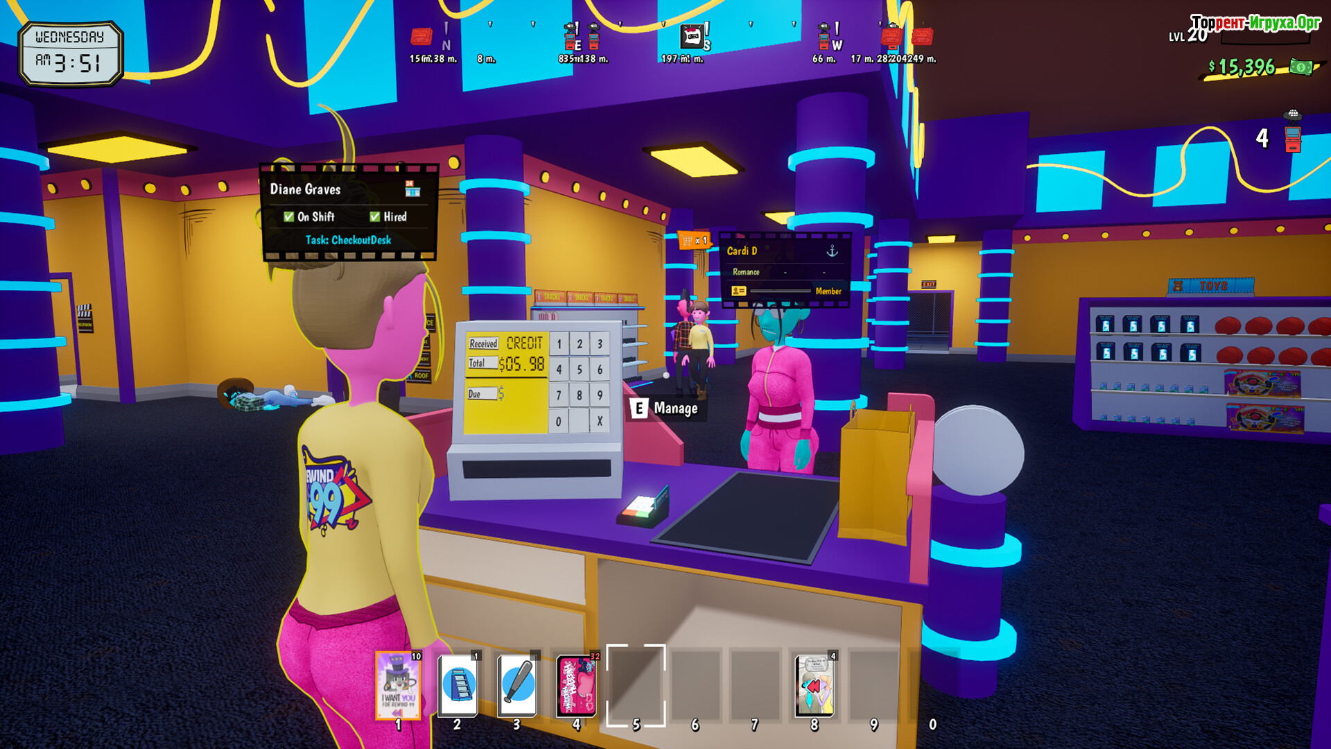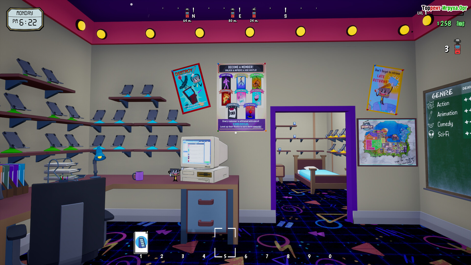 Управление видеопрокатом требует постоянного внимания: от заказа фильмов и расстановки товаров до обслуживания клиентов. С каждым днём магазин превращается в сложный механизм, где важно контролировать поставки, цены и предпочтения посетителей. Постепенно расширяя пространство и ассортимент, вы сможете превратить небольшой прокат в настоящую развлекательную зону, предлагая всё больше новых возможностей для посетителей.