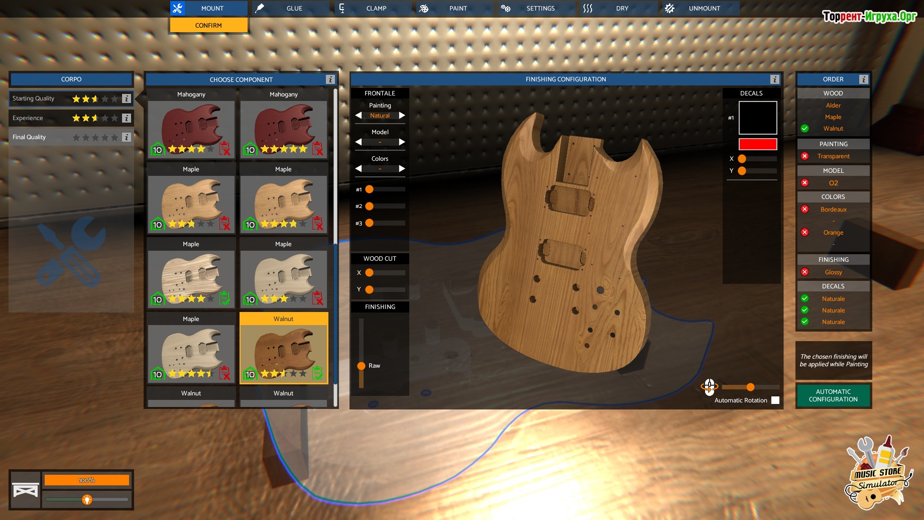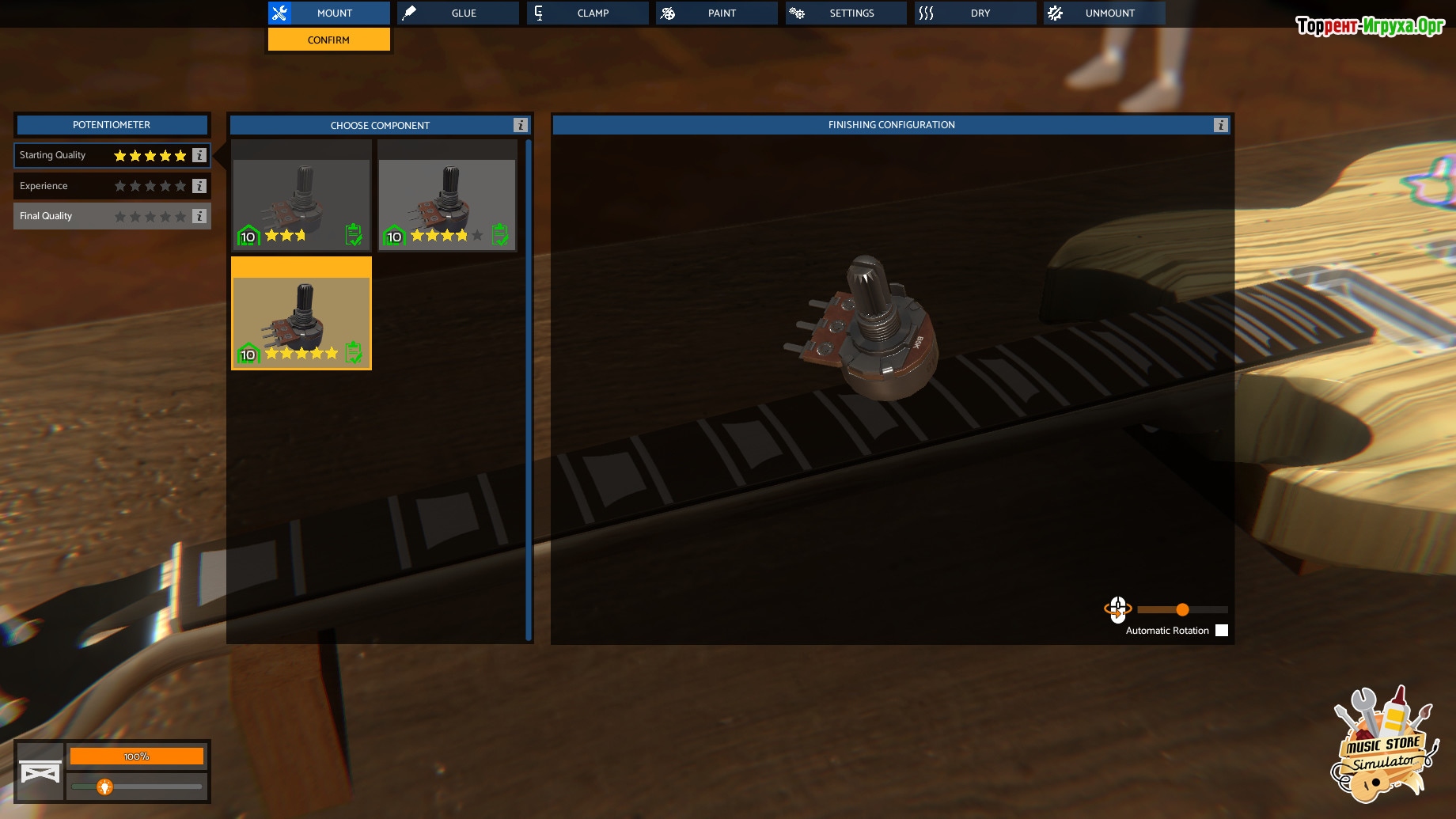 Главным в игре становится именно производство инструментов, а управление магазином уходит на второй план. Вы будете выбирать дизайн, определять музыкальную направленность и тонко настраивать каждую деталь, добиваясь идеального звучания. Когда инструмент готов, начинается поиск покупателей — клиенты сами будут приходить, но не стоит упускать выгоду от рекомендаций, которые помогут увеличить продажи. Заработанные средства можно грамотно инвестировать, расширяя возможности и улучшая качество продукции, что позволит вашему делу процветать.