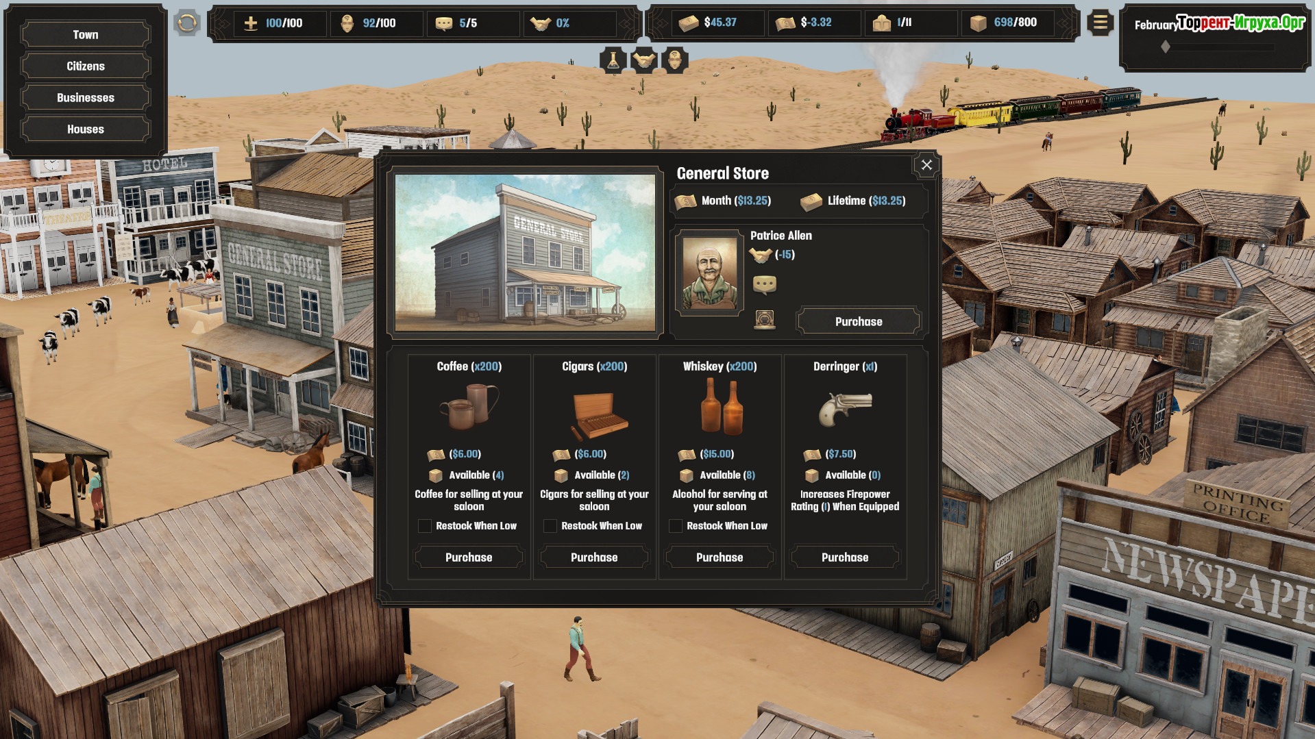 В процессе игры вы развиваете салон, формируя его уникальный облик и улучшая интерьер, чтобы привлечь как можно больше посетителей. Создайте комфортную атмосферу для путников, устанавливайте игровые автоматы, бордели и опиумные притоны, а также торгуйте оружием и спиртным, чтобы увеличить прибыль. Постепенно завязывайте отношения с жителями города, заводите друзей и даже находите любовь — всё это поможет укрепить вашу позицию.