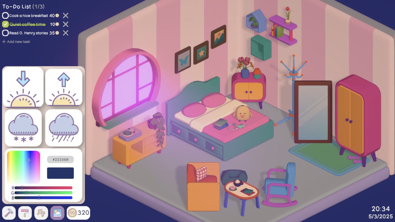 Your Personal Chill Apartment представляет собой медитативный симулятор, посвященный обустройству пространства, где уют создается не путем простых кликов, а через настоящие действия. Этот проект сочетает в себе визуальный редактор интерьера, расслабляющий звуковой фон, изменения освещения, погодные эффекты и систему наград за достижения, полученные вне игры. Комната становится зеркалом личного ритма жизни, в котором каждый предмет символизирует награду за шаг к себе, а каждое оформление служит визуальным отражением внутреннего состояния.